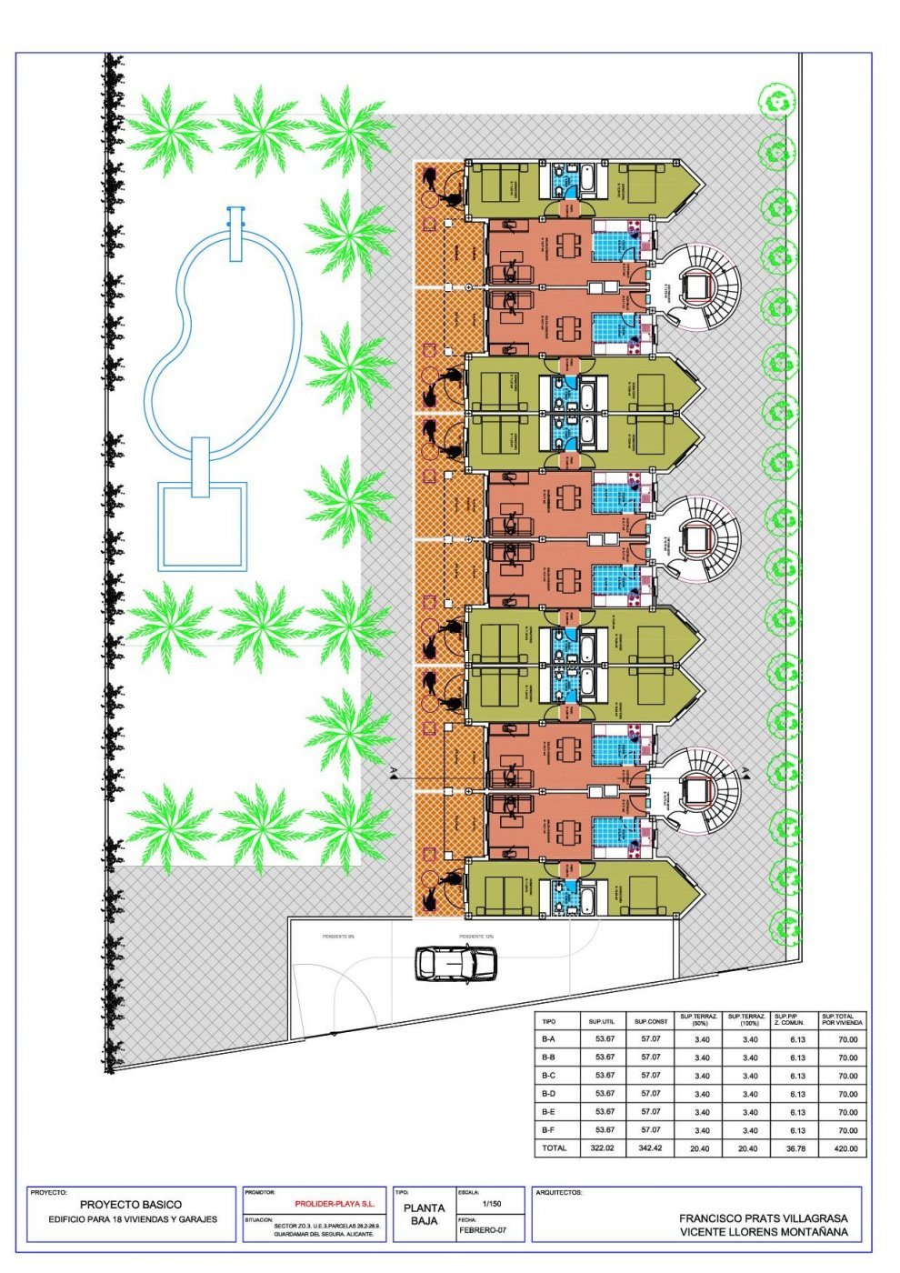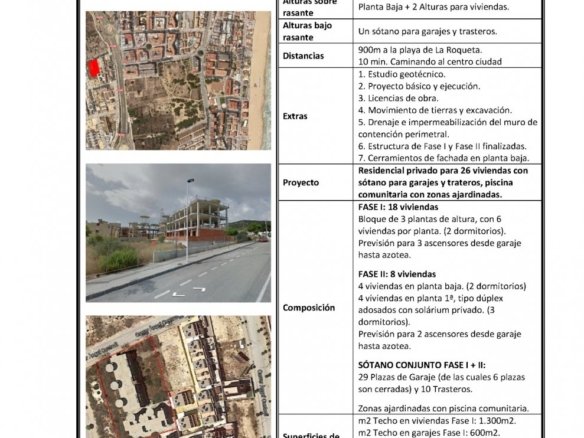 2,144m2 urban plot for sale with different phases of work already executed . Located in Sector ZO-3 (Los Secanos) of Guardamar del Segura. It includes projects, building license and the different phases of work already executed. Development for 26 homes with different types of houses; apartments and townhouses. In the basement, there would be 29 parking spaces and 10 storage rooms. Private residential with communal pool and garden areas in Guardamar del Segura (Alicante) less than 1 km from the Roqueta beach (Costa Blanca). The promotion is made up of two work phases: * Phase I: 18 apartment-type dwellings on the ground floor + 2 floors. * Phase II: 8 homes; 4 apartments on the ground floor and 4 townhouses on the 1st floor. Residential with private pool, garden areas and basement for 29 garages and 10 storage rooms. Forecast for 5 elevators (3 in Phase I and 2 in Phase II, with a route from the basement to the community solarium). Of the work phases already executed, it has: * Basic and Execution projects. * Geotechnical study. * Building licenses. * Earthmoving and excavation, * Drainage and waterproofing of the perimeter wall. * Structure Phase I and II. * Façade enclosures on the ground floor. Price of the land with licenses, projects and work phases already executed: € 1,800,000 Urban plot located in the residential area of ​​the Z.O.- 3 sector of Los Secanos, close to services and less than 1 km from La Roqueta beach in Guardamar del Segura (Alicante).