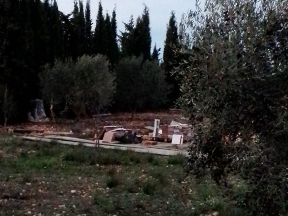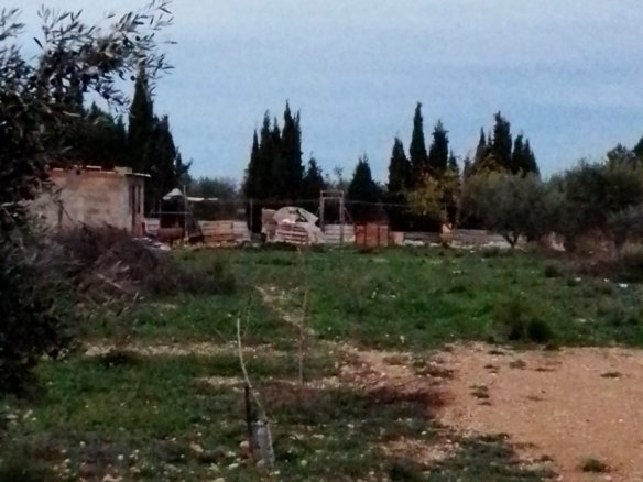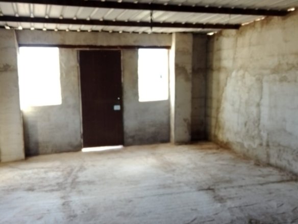 This concrete construction has 30m2 and needs to be completed, there is also a possibility to add another 20m2. There is mains water (irrigation water) and the plot of nearly 2100m2 is fully fenced. There is no electricity so a solar system is required, a complete off grid set can be bought at Obramat for just under 7.000 euro (this even includes a back up generator). There is a cesspit made with good pipes. It is currently registered as a warehouse, but once completed (adding a bathroom and kitchen) you can change it to a house. There are about 15 olive trees, and furthermore there are peach, almond, medlar and pistachio trees and laurel. There are also 2 fenced of areas to keep for example chicken.