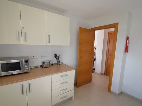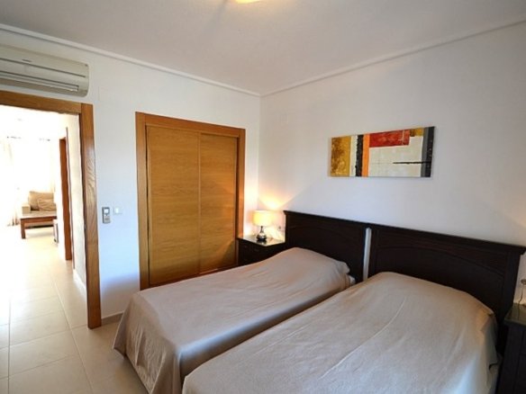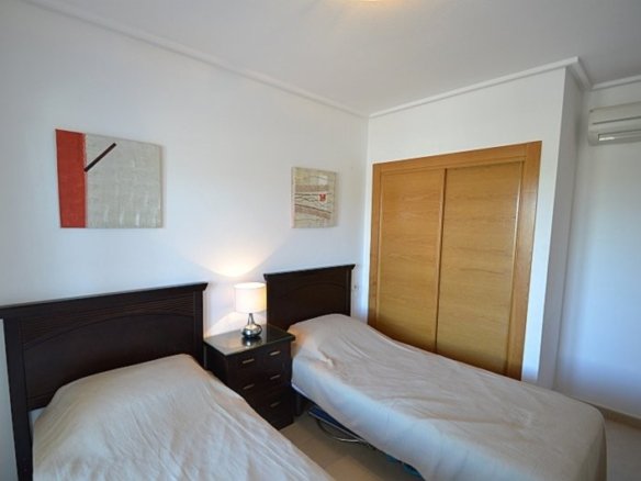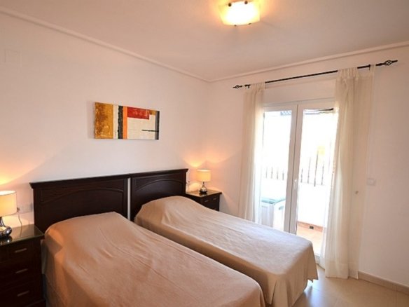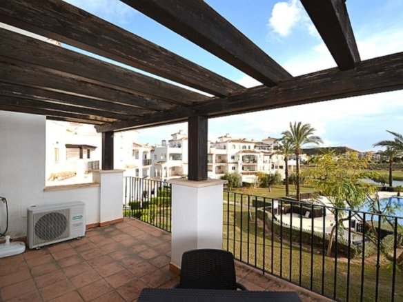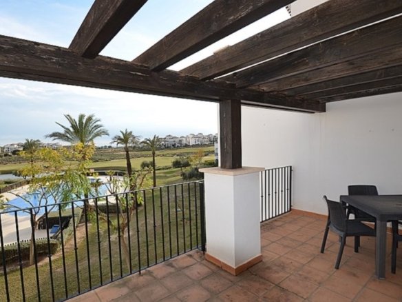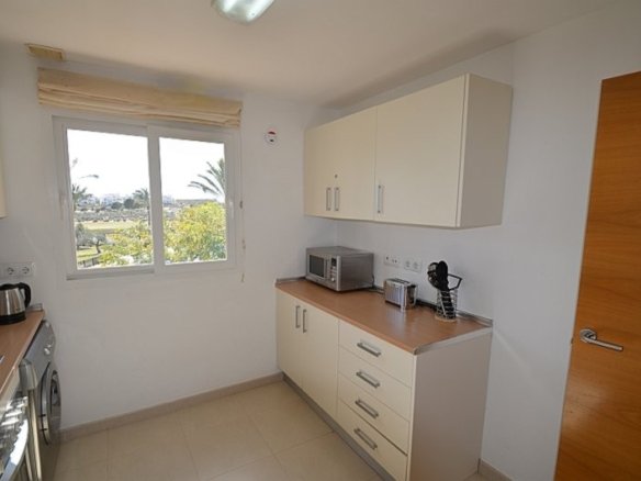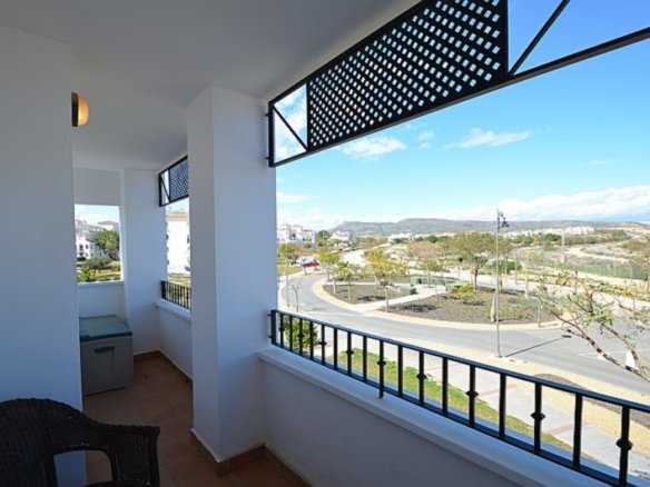 This well presented second floor curved wall style apartment is located on Phase 2 of the Resort with its Jack Niklaus designed 18 hole, par 72 golf course, known as being one of the best courses in the area. The apartment is accessed via a lobby entrance leading to the spacious kitchen and lounge.The kitchen is equipped with a range of floor and wall mounted units to each side with ample workspace, oven, hob, extractor and appliances.The lounge dining area is of the CURVED WALL DESIGN, with bi-folding doors that open fully leading out to the main terrace with pergola over. There are lovely views of one of the 19 swimming pools, communal gardens and golf course and lake beyond.The bathroom is situated on the left side of the hallway leading to the two large bedrooms. It comprises of WC, bidet, vanity unit with surface mounted wash hand basin and mirror above and bath with shower over. The master bedroom is located at the end of the hallway with the second bedroom to the right. Both bedrooms have double wardrobes with ample hanging space and drawers.Each bedroom has access to a terrace linking them which could easily be enclosed with glass curtains providing an alternative chill-out / seating area, ideal for relaxing and taking advantage of the morning sun.The friendly and typical Spanish village of Sucina with its bars, restaurants and church square is just a few minutes away by car.Murcia International airport is located approximately 20 minutes away by car and Alicante airport approximately 1 hour 15 minutes by car.The historic cities of Murcia and Cartagena are both located approximately 40 minutes away by car.The Costa Calida beaches running along the Mediterranean coastline are only a 20 minute drive away by car.Visit the GALLERY on our website to view photographs of places to visit in the local area and beyond.