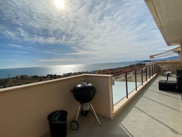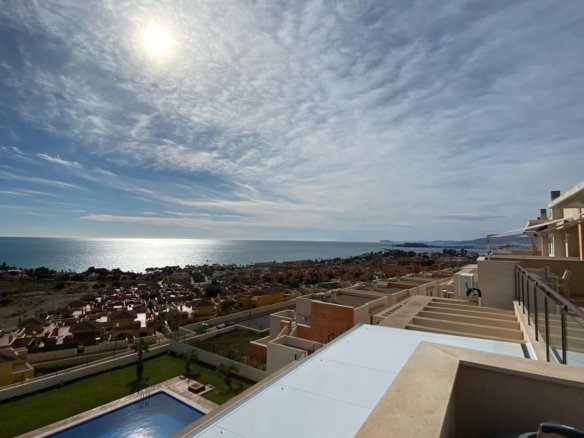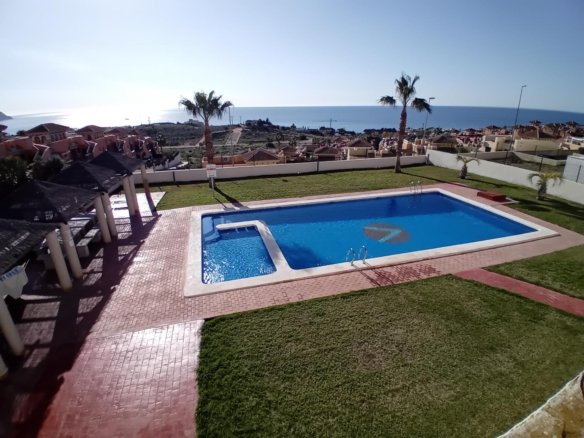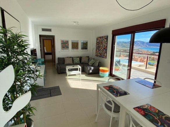 Perched at the very top of the sought-after Mojon Hills resort in Isla Plana, this exceptional two-bedroom apartment enjoys a truly commanding position with uninterrupted panoramic views across Isla Plana and the Costa Cálida coastline. Elevated, open, and bathed in natural light, the outlook alone sets this property apart. Built in 2010, the apartment offers a spacious and well-designed layout comprising two generous bedrooms and a modern family bathroom. It is sold fully furnished and equipped, with quality appliances throughout, allowing for immediate use either as a private residence or an income-generating investment. Hot and cold air conditioning ensures year-round comfort, while high-speed internet makes the property equally suitable for longer stays or remote working. Residents benefit from access to a well-maintained communal swimming pool and landscaped communal areas, all supported by very low community fees of just €50 per month. The property also includes an allocated parking space within the community, with additional ample parking available outside for guests. The elevated position not only guarantees privacy and views, but also makes this apartment highly attractive for holiday rentals. The property has a proven rental history, achieving nightly rates from approximately €100 in low season up to €250 during peak summer months, offering excellent potential returns. Whether you are seeking a lock-up-and-leave holiday home, a permanent residence with views, or a ready-made rental business, this apartment truly ticks every box. Opportunities in this prime position are limited. Contact us today to arrange a viewing and experience the views, space, and potential of this outstanding Mojon Hills apartment for yourself.