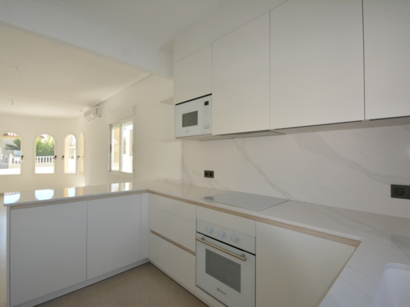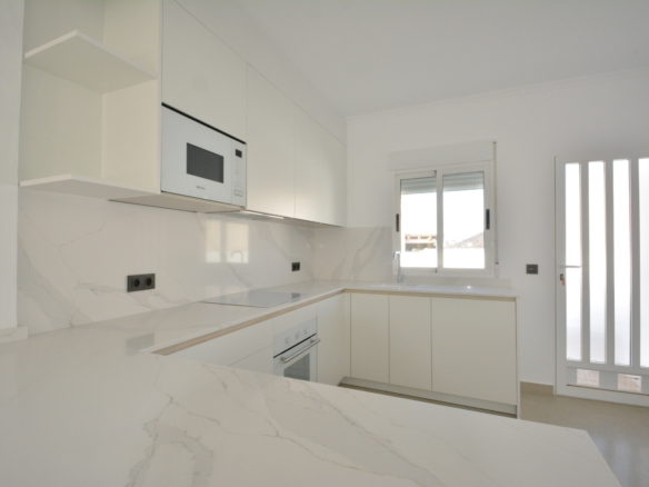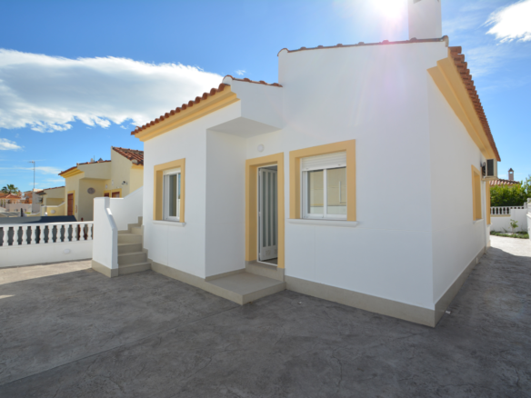 This charming detached house is located in the quiet residential area of Lo Crispin, Algorfa. The area is known for its peaceful atmosphere, easy access to services, and proximity to the beaches of Guardamar del Segura, only about 15 minutes away. The La Finca Golf Resort is just a 5-minute drive, Alicante city is around 35 minutes away, and Alicante Airport can be reached in about 30 minutes. The property offers a constructed area of 68 m² and a usable area of 44 m². It has two bedrooms and one completely renovated bathroom. The open-plan kitchen is brand new, equipped with new appliances, and connects seamlessly with the bright living area, which includes a split air conditioning unit. The entrance door is armoured for extra security. The house has been fully renovated, featuring new fitted wardrobes, new interior doors, new flooring, and fresh paint both inside and outside. The exterior area has been recovered in concrete, providing low maintenance and a clean, modern look. This south-facing home enjoys a private solarium of 36 m² with the possibility to create an additional room on the roof terrace. There is also a utility or storage room with access from the outside, water connections in the garden and solarium, and space to park up to two cars on the private plot. The covered porch can be glazed to expand the living area if desired. The urbanization is quiet and well-maintained, offering a communal swimming pool for residents. The property is sold unfurnished. Taxes and other purchase expenses are not included in the price.