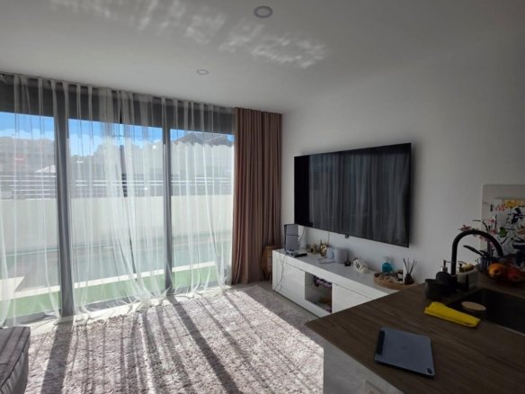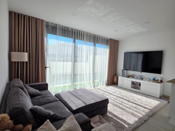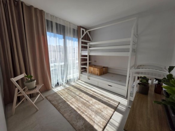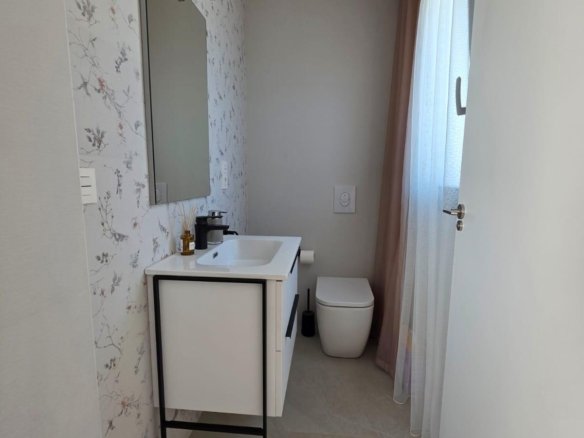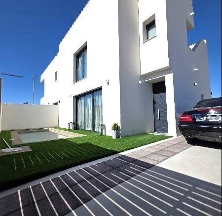 Detached and modern 2-story Villa on a 147 m2 plot, built in 2024, in a quiet Residential area in Benijofar, approximately a 5-minute drive from Ciudad Quesada. The ground floor consists of a large living room with sliding windows and access to the spacious terrace, a fully equipped open kitchen, a toilet and a storage room. The first floor consists of two double bedrooms and a complete bathroom with an Italian shower. With a solarium that offers magnificent panoramic views. Access via an internal staircase. The property has a private swimming pool (12.60 m2), a large garden with Mediterranean plants, a barbecue area and you can park the vehicle on the private plot. With direct access from the street. Furnished. Built-in wardrobes in the bedrooms. Ducted air conditioning. Modern style. High quality materials. Very good location, close to all amenities, supermarkets, cafes, and so on., about a 15-20 minute drive from the beaches of Guardamar and La Mata and about a 10-minute drive from La Marquesa Golf Course. A luxury! Ideal for relaxing and enjoying the wonderful Mediterranean climate!