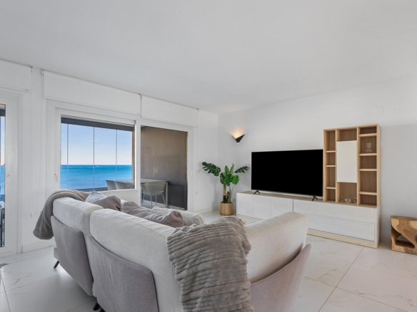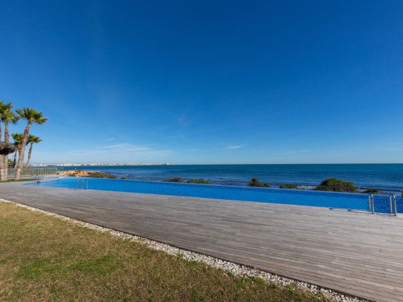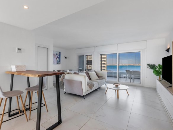 This exclusive 5th-floor apartment is located in the prestigious Posidonia residential complex, on the seafront in Punta Prima. Originally designed with three bedrooms, the property was modified off-plan to offer 94 m² of pure comfort, now distributed into two spacious bedrooms and two bathrooms, gaining exceptional spaciousness in the living areas.Its key strength lies in its double orientation and outdoor spaces: a 16 m² terrace with unobstructed views of the sea and the bay of Torrevieja, and a second 12 m² rear terrace facing south with views towards La Manga, guaranteeing sun, natural light, and cross ventilation throughout the day.The property is sold fully furnished, with an underground parking space and storage room included. The complex features high-standard common areas and security. Located within walking distance of amenities, supermarkets, and coves, it is approximately 45 minutes from Alicante Airport, combining luxury and comfort in one of the most sought-after areas of the Costa Blanca.