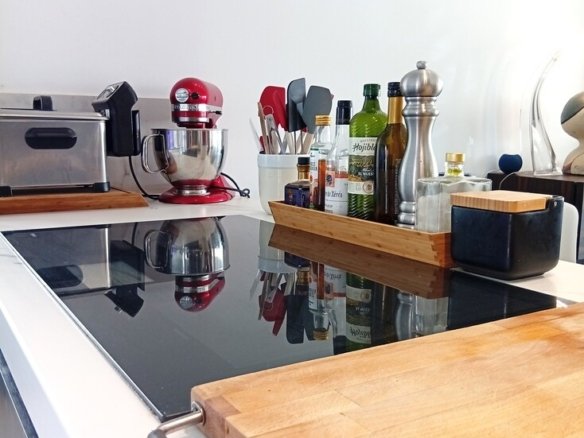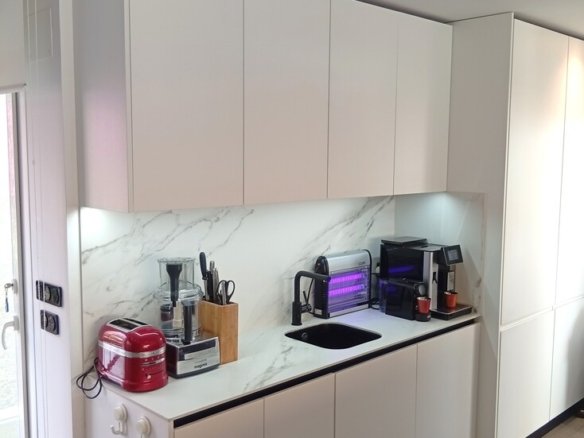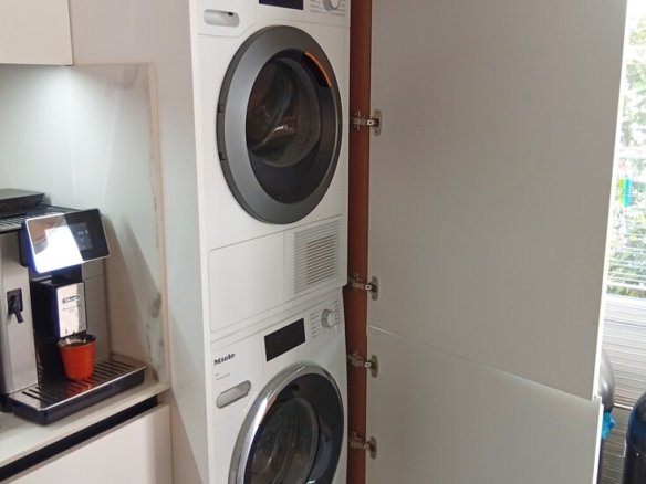 The villa features 2 spacious bedrooms (with the possibility to create a third bedroom – currently furnished as a dressing room/office), 2 modern bathrooms, a separate guest toilet, and an open plan living space with lots of natural light. The bathrooms have underfloor heating for extra comfort.The open kitchen is equipped with top-of-the-range appliances from brands such as Miele and Liebherr, which immediately underlines the quality of this property. The finish throughout the house is of a high standard, using durable, luxurious materials.Outdoor living & comfort