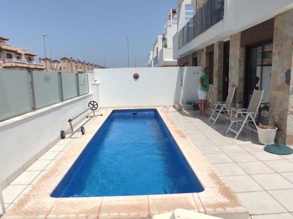 Welcome to Lomas de Cabo Roig in Orihuela Costa, where luxury and modern living come together in this exquisite detached villa. This stunning property offers an unparalleled combination of style, comfort, and convenience, providing an idyllic retreat for those seeking a truly exceptional lifestyle.Nestled within a peaceful residential area, this modern villa boasts a contemporary design that seamlessly blends with the surrounding Mediterranean landscape. The exterior showcases clean lines, sleek finishes, and large windows that allow natural light to flood the interiors, creating a bright and airy ambiance.As you enter the villa, you are greeted by a spacious and inviting living area that serves as the heart of the home. The open-plan layout effortlessly connects the living room, dining area, and a fully equipped modern kitchen, making it an ideal space for entertaining guests or enjoying quality time with family.The villa features two bedrooms, providing ample space for relaxation and privacy. Each bedroom has been thoughtfully designed to offer a tranquil sanctuary, with tasteful decor, built-in wardrobes, and large windows that frame picturesque views of the surrounding landscape.The villa also boasts two luxurious bathrooms, showcasing contemporary fixtures and finishes. These well-appointed bathrooms offer a spa-like atmosphere, where you can indulge in a rejuvenating bath or invigorating shower after a long day.One of the standout features of this exceptional villa is the private heated swimming pool, perfect for year-round enjoyment. Whether you prefer a refreshing dip on a hot summer day or a relaxing swim under the stars, this pool offers the ideal setting. The pool area is complemented by a spacious terrace, providing ample room for sun loungers, outdoor dining furniture, and a barbecue area, allowing you to make the most of the fantastic Mediterranean climate.Additionally, the villa boasts a large solarium, offering breathtaking panoramic views of the surrounding area. This versatile space provides an ideal spot for sunbathing, hosting gatherings, or simply unwinding while enjoying the stunning vistas.Lomas de Cabo Roig is a sought-after location, known for its tranquil atmosphere and proximity to a wide range of amenities. Within a short distance, you’ll find pristine sandy beaches, championship golf courses, vibrant restaurants, shops, and entertainment options, ensuring that you have everything you need within easy reach.In summary, this modern detached villa in Lomas de Cabo Roig presents a rare opportunity to own a luxurious retreat in one of Orihuela Costa’s most desirable locations. With its private heated swimming pool, spacious terrace, solarium, two bedrooms, and two bathrooms, this property offers a perfect blend of comfort, elegance, and modern living.Detached Villa, Orihuela Costa, Costa Blanca.2 Bedrooms, 2 Bathrooms, Built 100 m², Terrace 50 m².Setting : Close To Golf, Close To Port, Close To Shops, Close To Sea, Close To Town, Close To Schools, Close To Marina, Urbanisation.Orientation : North East, East, South, West.Condition : Excellent.Pool : Private.Climate Control : Air Conditioning, Hot A/C, Cold A/C.Views : Street.Features : Fitted Wardrobes, Private Terrace, Solarium, Marble Flooring, Double Glazing.Furniture : Fully Furnished.Kitchen : Fully Fitted.Parking : Underground, Private.Category : Resale.