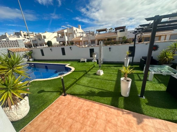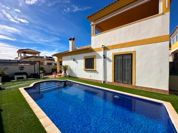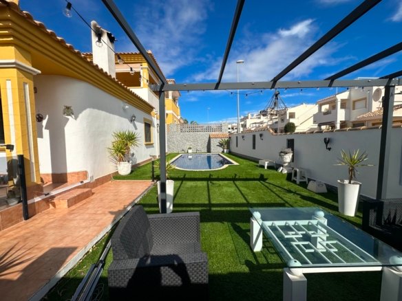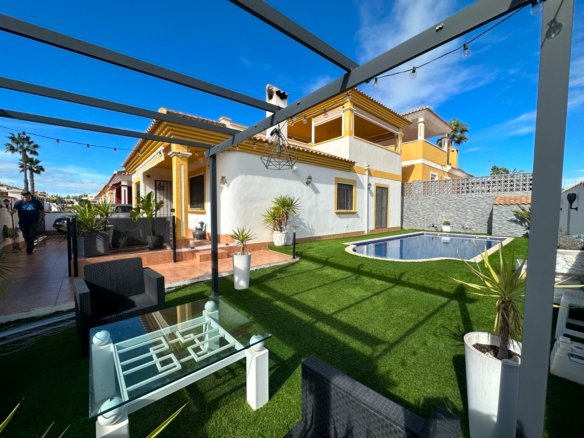This stunning one-level villa is perfectly situated in the sought-after community of Laguna Green I, right by the popular Vistabella Golf course. Sitting on a generous corner plot of over 200m², this home combines modern comfort with a relaxed Mediterranean lifestyle. The property features: 2 spacious bedrooms and 2 modern bathrooms (master en suite) A bright, open-plan living area with air conditioning and a wood burner for year-round comfort A beautifully renovated interior finished to a high standard A large private pool and expansive terrace area – ideal for entertaining or relaxing in the sun A private solarium offering additional outdoor space A storage shed for added convenience With its prime location, generous outdoor areas, and stylish upgrades, this villa makes a perfect permanent residence, holiday retreat, or rental investment on the Costa Blanca.