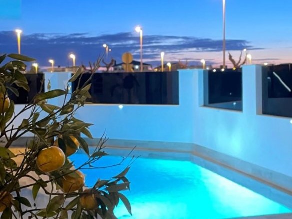 Step into contemporary comfort with this stylish, south-facing detached villa, built in 2024 and presented in as-new condition. Located in the heart of San Pedro del Pinatar, this two-bedroom, two-bathroom home stands out with high-end finishes and thoughtful extras throughout. The villa boasts a bright and extended living room with direct access to the sun-drenched outdoor areas. A private balcony and a spacious roof terrace with a fully equipped outdoor kitchen, lighting, and a sleek pergola offer the perfect setting for entertaining or relaxing in the Spanish sun. Additional features include: Private garage with custom storage cabinets. Opportunity to convert into a third bedroom with bathroom. External staircase to roof terrace Built-in dimmers for mood lighting Extra electrical sockets throughout for modern living Whether you’re seeking a stylish holiday escape or a year-round residence with all the modern conveniences, this home delivers on every level.