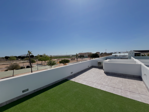 Discover this beautiful new build villa located in the heart of Roldan, Torre-Pacheco, where luxury and comfort come together for an exclusive lifestyle. The property is not furnished, but for an additional cost starting from €10,000, you can obtain a complete furniture package from us! With 2 spacious bedrooms, a private pool and a generous outdoor space, this villa offers the perfect setting for relaxation and entertainment. Soak up the Spanish sun on the large roof terrace or relax in the private pool. Inside, the villa has all modern amenities, from a fully equipped kitchen with all appliances including dishwasher, microwave, convection oven, induction hob, extractor fan, large fridge and freezer. Outside, you can enjoy an exceptionally large outdoor space where you have the sun all day. From midday until the last minutes of the day, you can linger under the Spanish sun. With a convenient location near local amenities and golf resorts, and a short distance from the airport and Mar Menor beaches, this villa offers the ideal mix of comfort, convenience and luxury.Roldan itself is a traditional town with all the local amenities you need, including supermarkets, restaurants, bars, clinic, pharmacy, police station, petrol station, mechanics, dentists, doctors and much more.The nearby golf resorts of La Torre, & Terrazas are easily accessible, Corvera Airport is 15 minutes away and the beaches of the Mar Menor just a 20-minute drive away.Whether you are looking for a holiday home or a permanent home, this villa has everything you need.Contact us today and make your dream of Spanish living a reality!