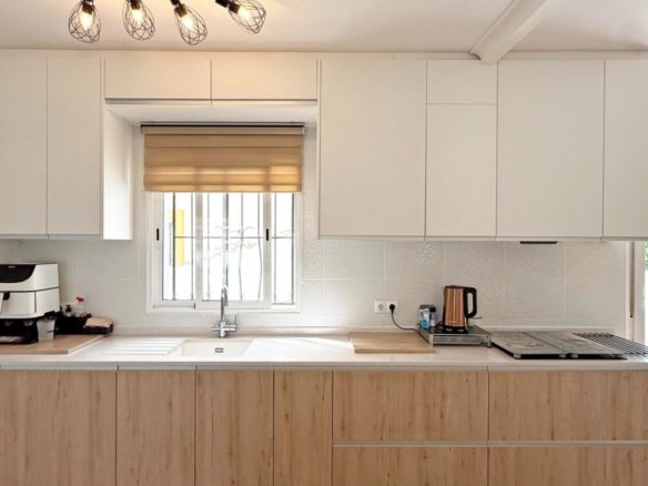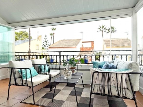 This beautifully maintained villa has been thoughtfully reformed into a 2/3-bedroom home, offering the perfect blend of comfort and style. The property features a private pool, three bathrooms (two of which are en-suite), a spacious kitchen-diner, and a large lounge with direct access to a balcony that overlooks the pool. The balcony can be enclosed with glass curtains, making it ideal for year-round enjoyment. The guest bedroom opens onto a private patio, also fitted with glass curtains, while the master bedroom boasts a generous solarium with stunning sea views. Additional highlights include air conditioning throughout, optional central heating, two large storage rooms, and an excellent location in a quiet and private area of Villamartin. All this just a short walk from the famous Villamartin Plaza and the golf course.