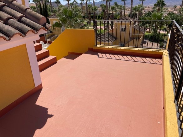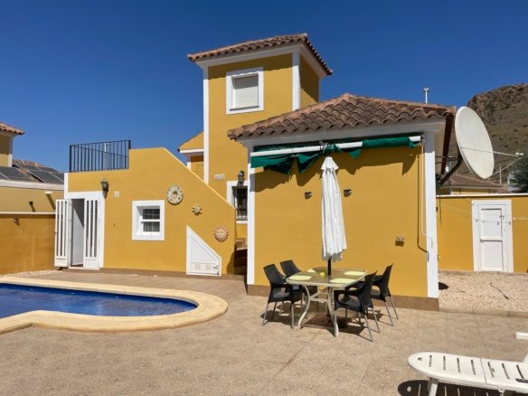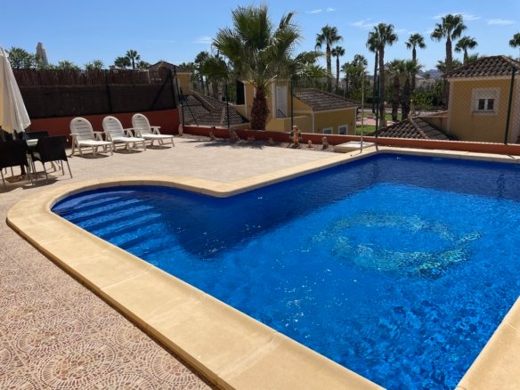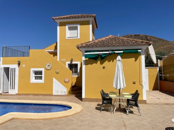 A very nice, detached villa with 3 bedrooms and 1 bathroom on Mazarron Country Club in Murcia. The property benefits from a private swimming pool, off road parking, air-conditioning, solarium and a tower room that is currently used as storage. With wonderful, elevated views, viewing is highly recommended.Comprising, an open plan lounge with plenty of natural light via folding doors and high ceilings. You have an extended kitchen and dining area all with ducted hot and cold air-conditioning. The kitchen and dining area has plenty of natural light coming in due to the large windows and doors plus high ceilings. From the kitchen you can access the pool area and garden via a glass door and there is a lovely, shaded terrace area, ideal for relaxing, dipping in the pool and al fresco dining. Off the lounge is the fully fitted kitchen complete with granite work surfaces and white goods including a dishwasher. Two bedrooms have fitted wardrobes, ceiling fans and air conditioning but the third bedroom doesn’t. Adjacent to the bedrooms is the fully tiled bathroom with enclosed shower, hand basin, vanity unit and W/C.The garden is nearly all tiled apart from a few gravelled sections with plants and shrubs. The 8 x 5 swimming pool has Roman steps to the corner of the pool and there is an awning for shade by the pool as well. There is a driveway for off-road parking, and you can access the rear garden and pool from here. From the garden you can access the tower room via a few stairs and the solarium. The tower room is ideal for storage, and you have further storage under the staircase. Being sold as seen, with some new furnishings and electrical appliances included. On a 350 sqm plot, community fees are approx. 45 Euros per month and the IBI (council tax) is approx. 280 Euros per annum.As the Country Club is a private community there is a monthly fee payable to cover the upkeep of communal areas including gardening, security cameras, street lighting, rubbish removal etc. This residential community has a bar/restaurant, communal swimming pool, kids pool, function room, petanca lanes and has social committees who organise various functions including coach trips to places of interest.Murcia international airport is just 25 minutes drive and Alicante airport approximately 70 minutes. All amenities can be found in Mazarron town which is 5 minutes away and a selection of lovely beaches in Puerto de Mazarron and Bolnuevo are within 10 minutes plus the nearest golf course is only 5 minutes away. Just 10 minutes away you have the Jack Nicklaus designed golf course at Condado de Alhama and plenty of bars, restaurants and other amenities to enjoy.