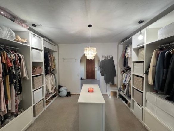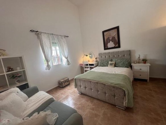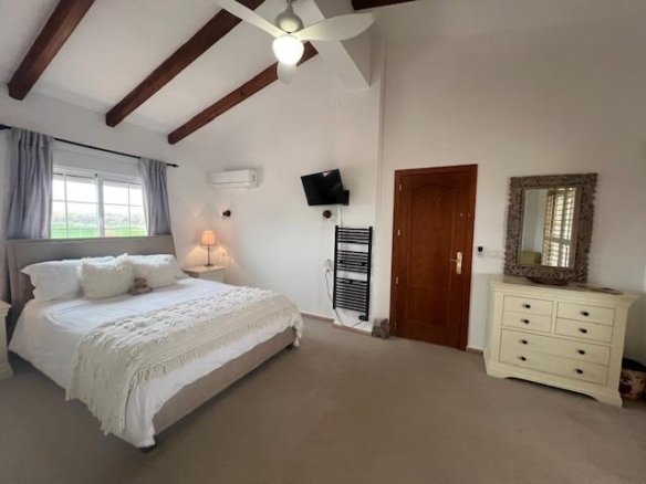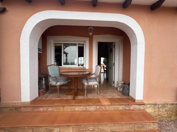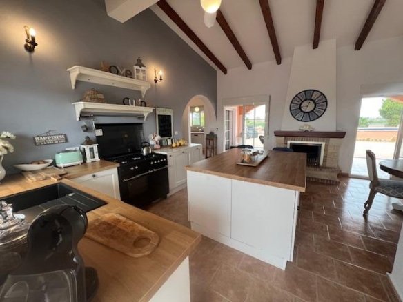 Stunning country house in Dolores, ALICANTE with 3 double bedrooms, 2 bathrooms, 2 walk-in wardrobes, lounge/diner with fireplace open kitchen, separate preparation kitchen, study andsecond lounge with access to decking area to the garden. The villa is on a fenced plot of 6,300m with a 10 x 5m pool with large terrace surround. Ideally situated in a peaceful rural setting although close to town and only 15 mins’ drive to beaches and 35 mins to the airport of Alicante/Elche. Enjoy the superb views from the rooftop sun terrace. Mains water and electricity via solar panels with back up generator.