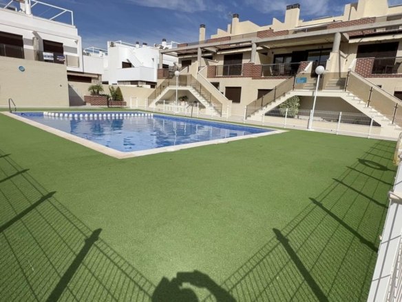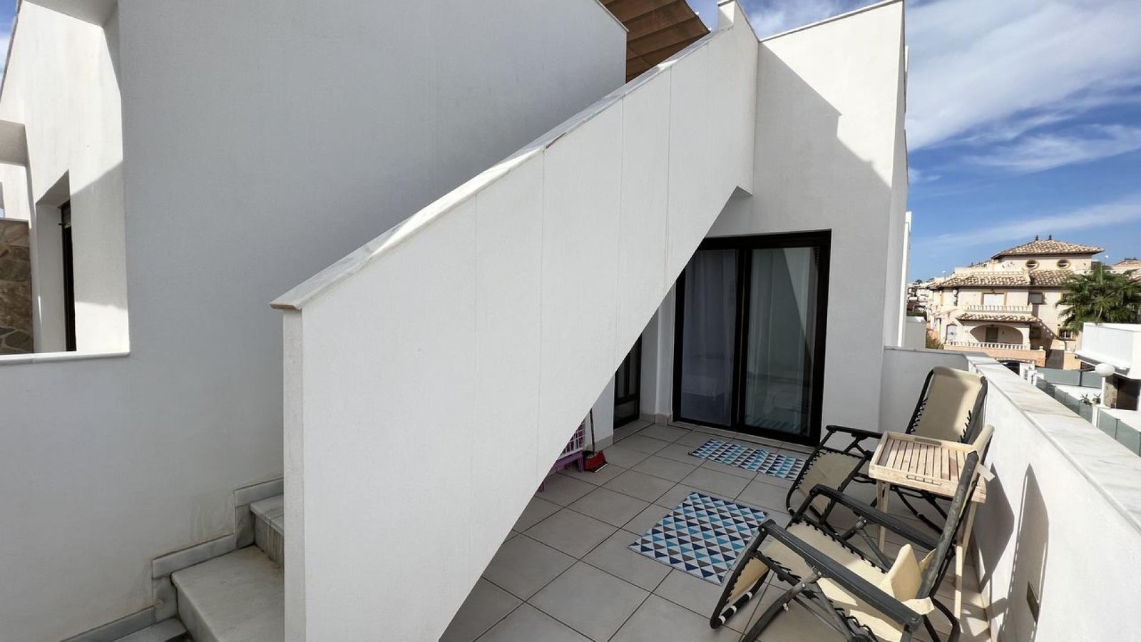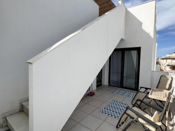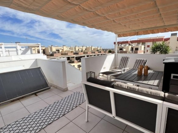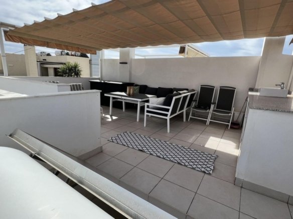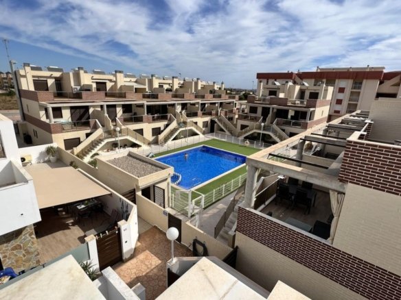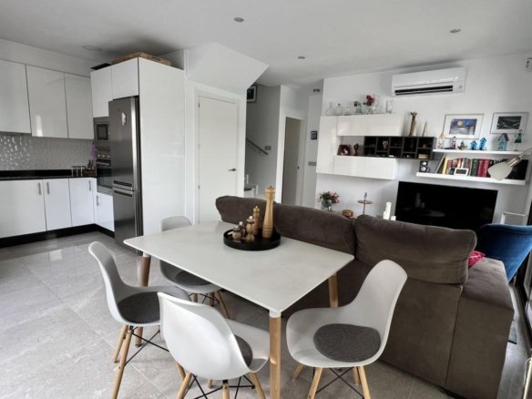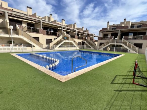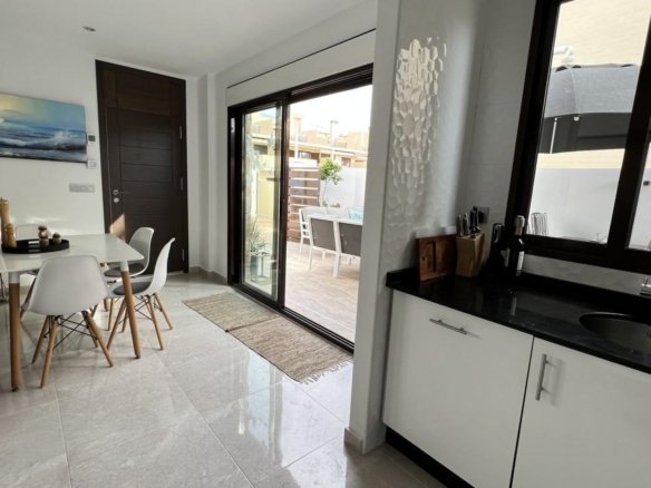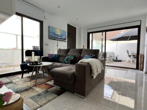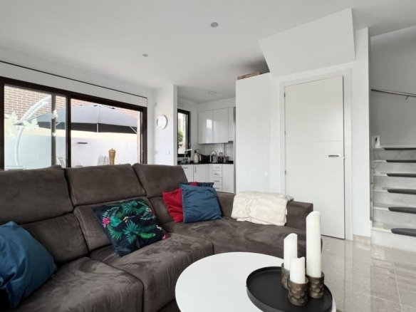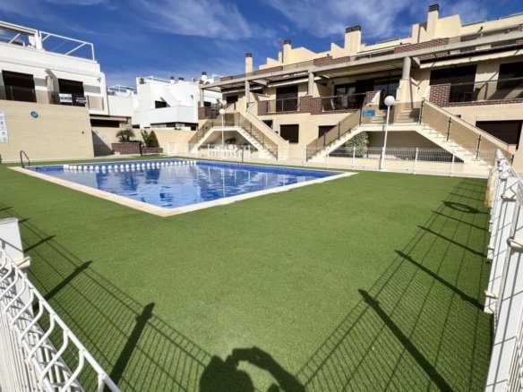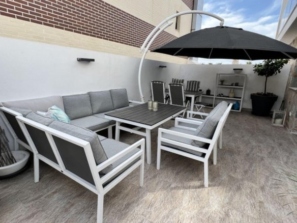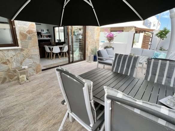 In Cabo Roig, within the exclusive Residencial Sinergia World Fase III, you will find this beautiful semi-detached villa with two floors and a private solarium, located in a gated community built in 2017 and facing northeast.The property has a very practical layout. On the ground floor, there is a bright living-dining room, French-style kitchen, utility/laundry area, as well as 1 bedroom with a fitted wardrobe and 1 full bathroom, ideal for guests or convenient single-level living. On the first floor, there are 2 spacious bedrooms with fitted wardrobes, 1 full bathroom, and a pleasant terrace.Outside, the property features a large tiled corner garden, perfect for enjoying the Mediterranean climate all year round. It also offers a spacious private solarium equipped with an awning and summer kitchen, ideal for relaxing or entertaining family and friends.The residential complex provides excellent communal facilities including a swimming pool, gym and sauna, creating a comfortable and exclusive environment.The property also includes a private underground parking space with a storage room and is sold fully furnished and equipped, ready to move in.Excellent location close to all amenities, just 2.5 km from the beach, 3 km from golf courses, and approximately 45 minutes from Alicante Airport.Community fees: €660 per year Property tax (IBI): €360 per year