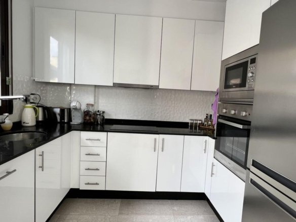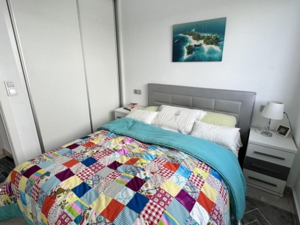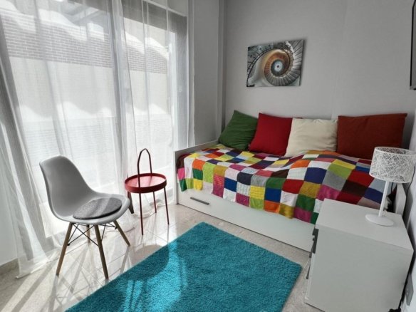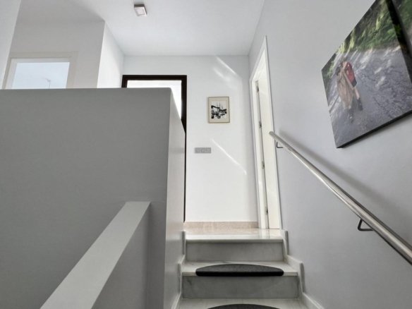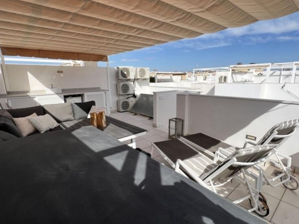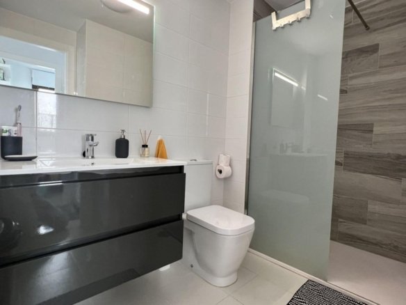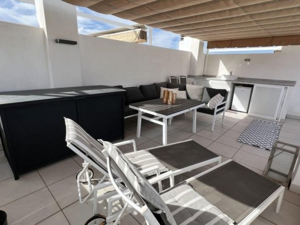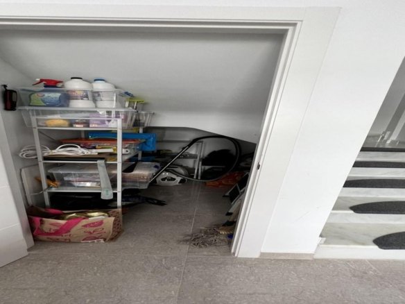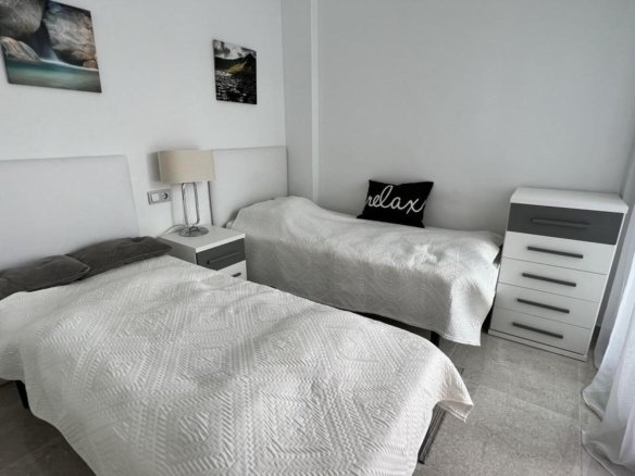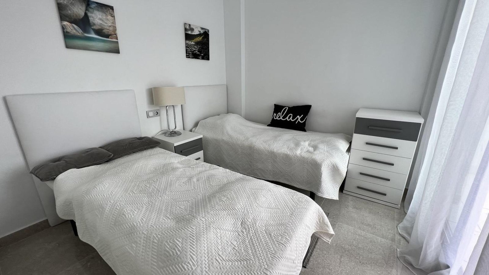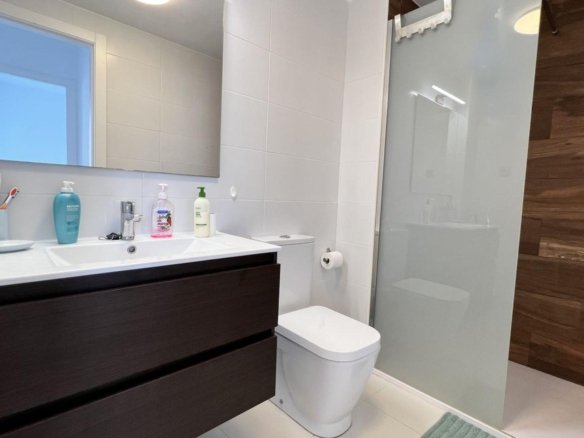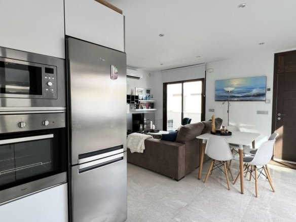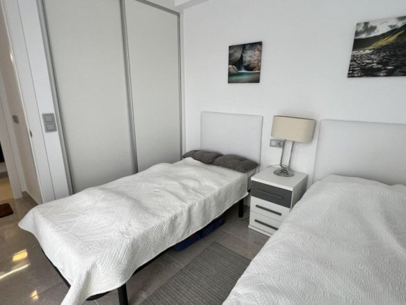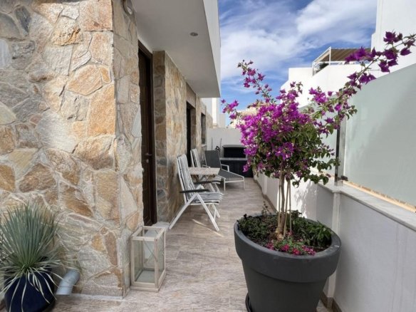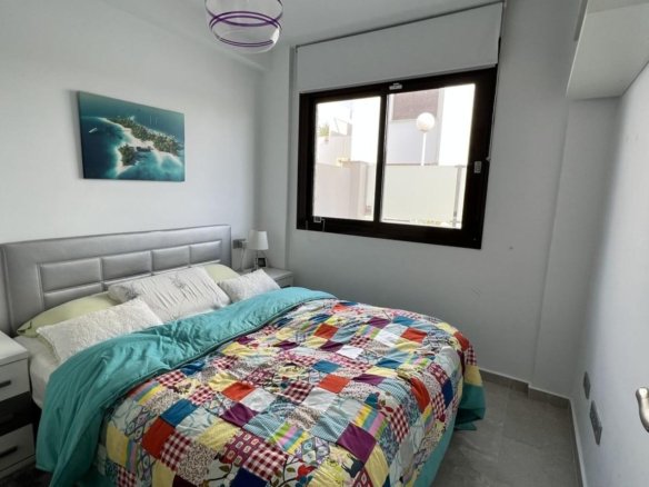 In Cabo Roig, within the exclusive Residencial Sinergia World Fase III, you will find this beautiful semi-detached villa with two floors and a private solarium, located in a gated community built in 2017 and facing northeast.The property has a very practical layout. On the ground floor, there is a bright living-dining room, French-style kitchen, utility/laundry area, as well as 1 bedroom with a fitted wardrobe and 1 full bathroom, ideal for guests or convenient single-level living. On the first floor, there are 2 spacious bedrooms with fitted wardrobes, 1 full bathroom, and a pleasant terrace.Outside, the property features a large tiled corner garden, perfect for enjoying the Mediterranean climate all year round. It also offers a spacious private solarium equipped with an awning and summer kitchen, ideal for relaxing or entertaining family and friends.The residential complex provides excellent communal facilities including a swimming pool, gym and sauna, creating a comfortable and exclusive environment.The property also includes a private underground parking space with a storage room and is sold fully furnished and equipped, ready to move in.Excellent location close to all amenities, just 2.5 km from the beach, 3 km from golf courses, and approximately 45 minutes from Alicante Airport.Community fees: €660 per year Property tax (IBI): €360 per year