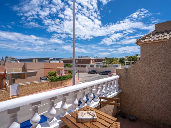 This charming and well-designed townhouse offers both style and functionality ? perfect for the family looking for something more. On the ground floor, you are welcomed by a spacious terrace with separate access to a large storage room in the basement. From here, you also enter the home, where you?ll find the hallway, living room, dining area, and kitchen with direct access to a practical patio for laundry and storage. This floor also includes one of the two bathrooms. Upstairs are three bedrooms and another bathroom. The master bedroom has its own balcony and a small walk-in closet, adding extra convenience to daily life. Going up one more flight of stairs, you?ll reach an additional room currently used as an office. From here, you access the rooftop terrace, which is equipped with a BBQ, water tap, and sun protection ? a perfect spot for relaxation and social gatherings. The home has been tastefully renovated by an interior designer, with attention to every detail. It is thoughtfully designed, stylish, and move-in ready with no need for renovation. There are many storage solutions, including built-in wardrobes and a large storage room. The property also has solar panels to heat water, contributing to a more sustainable and energy-efficient lifestyle. Within the enclosed community, you have access to a shared pool area and a private, numbered parking space.Gran Alacant is a popular and vibrant area on the Costa Blanca. Here, you are close to the beach, beautiful nature, shopping, restaurants, schools, and all the services you need in everyday life. The Clot de Galvany nature reserve offers lovely walking trails and rich wildlife, and for families, the small tourist train in the area is a charming feature. Here, tranquility and security combine with proximity to everything you need.A home to thrive in, whether it becomes your permanent residence or a holiday home. Stylish, well-thought-out, and full of possibilities.Welcome home.