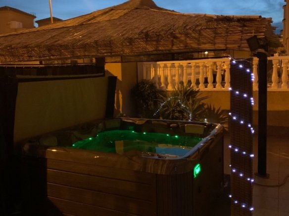 Beautiful house located in a quiet area of Las Filipinas (Orihuela Costa). The house is built on two levels. On the ground floor, there is a kitchen that opens onto the living room, a bedroom and a bathroom. Upstairs, there is a bathroom and two bedrooms, one of which has a balcony. There is also a terrace leading to the solarium, where there is a storage room. The outdoor area is pleasant with several terraces, one of which is covered, a jacuzzi, a parking space and a storage room. The house has air conditioning in the living room and in all bedrooms. Each bedroom has a built-in wardrobe. It is sold fully furnished and has a tourist licence. The complex offers a beautiful communal swimming pool. It is within walking distance of amenities, close to several golf courses, 6 km from the beautiful beaches of the Costa Blanca and 55 km from Alicante airport.