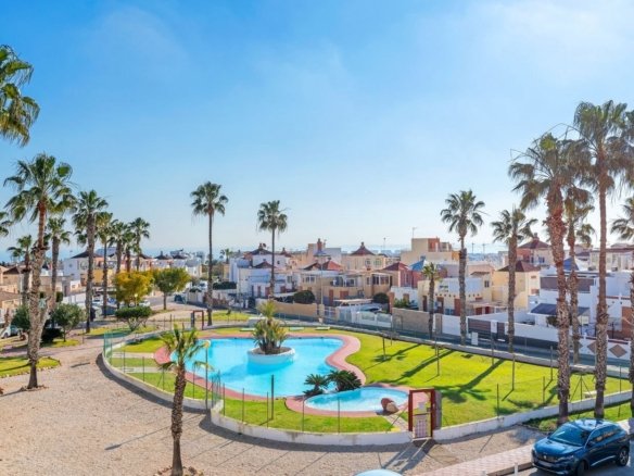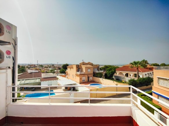 Beautiful corner quad house with a huge garden for sale in El Mirador de Los Altos, Orihuela Costa. This charming quad house is located in a well-established and peaceful residential area of Los Altos, featuring a beautiful communal pool surrounded by landscaped gardens. The property offers 3 bedrooms and 2 bathrooms, a bright and inviting living room, and an open-plan kitchen with direct access to the garden. Outside, you’ll find a very spacious corner garden with off road parking parking and a brand new electric gate. At the very top, a private roof terrace provides the perfect spot to relax and enjoy the sun. The home comes with air conditioning and will be sold fully furnished, ready to move in.The property has been recently painted on the outside. Los Altos is a sought-after residential area just 4 km south of Torrevieja. All essential services are within walking distance, including supermarkets, shops, bars, restaurants, and more. A short drive takes you to the sandy beaches of Orihuela Costa and the popular Zenia Boulevard shopping centre