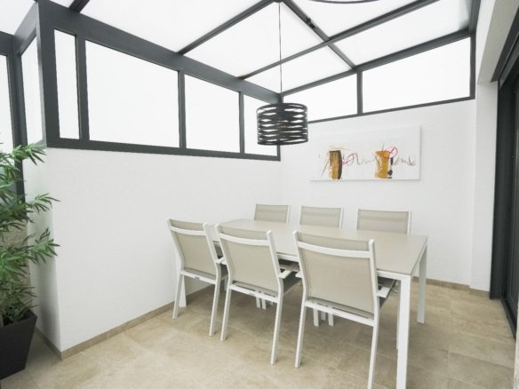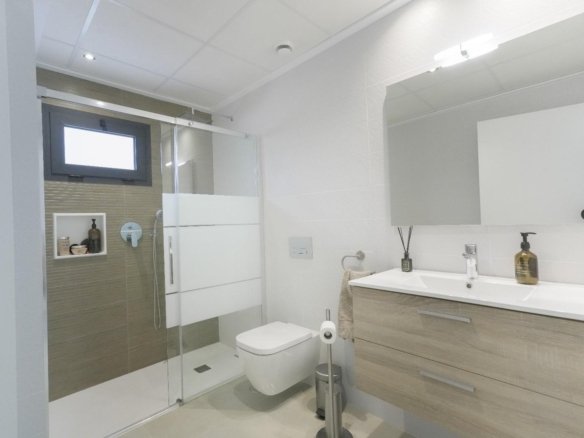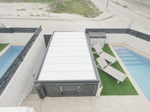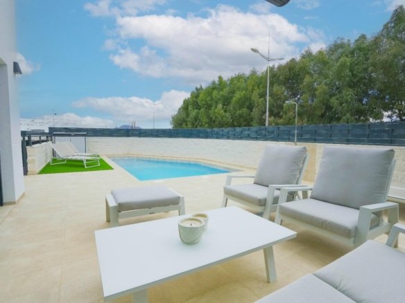 This stunning villa, built in 2023, offers modern living in the peaceful area of Dolores, Alicante. Dolores is a charming town located in the province of Alicante, offering a relaxed, rural atmosphere while being close to the Mediterranean coast. The town has all essential services, including supermarkets, shops, medical centers, schools, and restaurants. Its location provides easy access to larger cities such as Torrevieja and Orihuela, as well as beautiful beaches just a few minutes’ drive away. Dolores is perfect for those seeking a peaceful and authentic lifestyle in Spain, with all the comforts of modern life. With 3 spacious bedrooms and 2 bathrooms, the villa is designed for comfort and convenience. The open-plan living area is bright and spacious, seamlessly connecting with the fully equipped kitchen. Step outside to enjoy the covered dining area, ideal for al fresco dining and entertaining guests. The private pool offers a relaxing space to unwind, while the on-site parking area provides secure parking. This villa combines contemporary style with practical living, making it an ideal choice for those seeking a modern and tranquil lifestyle in Alicante.
