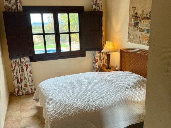Welcome to a truly special home on Hacienda del Álamo Golf Resort, where space, privacy and breathtaking views come together in perfect harmony.Located on Calle Alemania, this west-facing villa enjoys unobstructed views over the golf course, surrounding mountains and unforgettable sunsets. Set on a generous 1,000 m² plot, the property offers peace, privacy and a warm Mediterranean atmosphere—ideal for both full-time living and luxurious holidays.The villa is beautifully maintained, built in 2001 with quality finishes, and comes completely furnished, ready for you to move in and enjoy from day one. The sun-drenched terrace and private 10 x 5 m swimming pool create the perfect outdoor living space, ideal for relaxing, entertaining and making the most of Murcia’s climate.Inside, the home feels welcoming and light-filled. The living room is a true highlight, featuring a log burner and stunning views of the pool and golf course—perfect for cosy winter evenings or relaxed summer nights. The fully equipped kitchen has a separate access to the garden, blending indoor and outdoor living seamlessly.The layout is both practical and flexible, offering three spacious bedrooms with built-in wardrobes—two on the ground floor and one on the first floor—along with two complete bathrooms. Upstairs, a charming gallery with sitting area provides an ideal space for reading, working, or simply enjoying the views, accessed via a wide and elegant spiral staircase.The garden is beautifully landscaped yet easy to maintain, featuring lemon trees, olive trees and mandarins, adding to the authentic Spanish feel. Additional features include private parking or driveway space, covered storage for bikes or equipment, and a 150-litre hot water boiler.Key Features at a Glance• 3 bedrooms | 2 bathrooms• 145 m² useful build area• 1,000 m² private plot• West-facing with sunset, golf and mountain views• Private 10 x 5 m swimming pool• Completely furnished• Quiet, private and not overlookedPrime Location• Murcia city: 25 km• Cartagena: 30 km• Corvera Airport: 12 km• Nearest beaches: 35 kmAs part of Hacienda del Álamo Golf Resort, owners enjoy access to a championship 18-hole golf course, SPA hotel, supermarket, shops, bars and restaurants, all within a secure, gated and immaculately maintained resort. The setting offers a relaxed Mediterranean lifestyle with excellent accessibility and strong investment appeal. Price: €499,000The owners are selling due to private reasons, making this a rare opportunity to acquire a high-quality villa in one of Murcia’s most sought-after golf resorts.If you are looking for space, views, privacy and true Mediterranean living, this exceptional property deserves your attention.