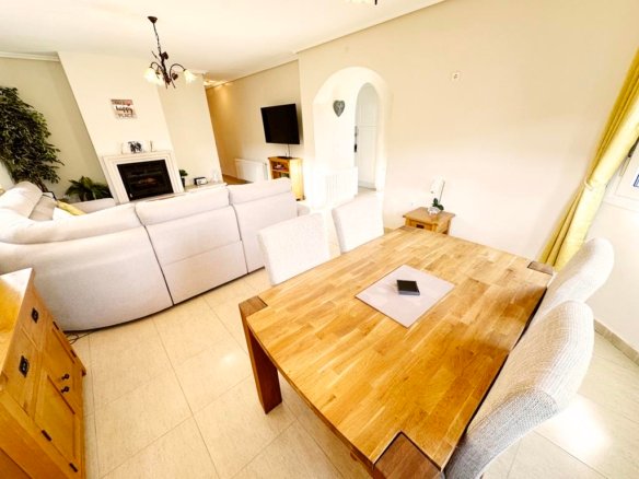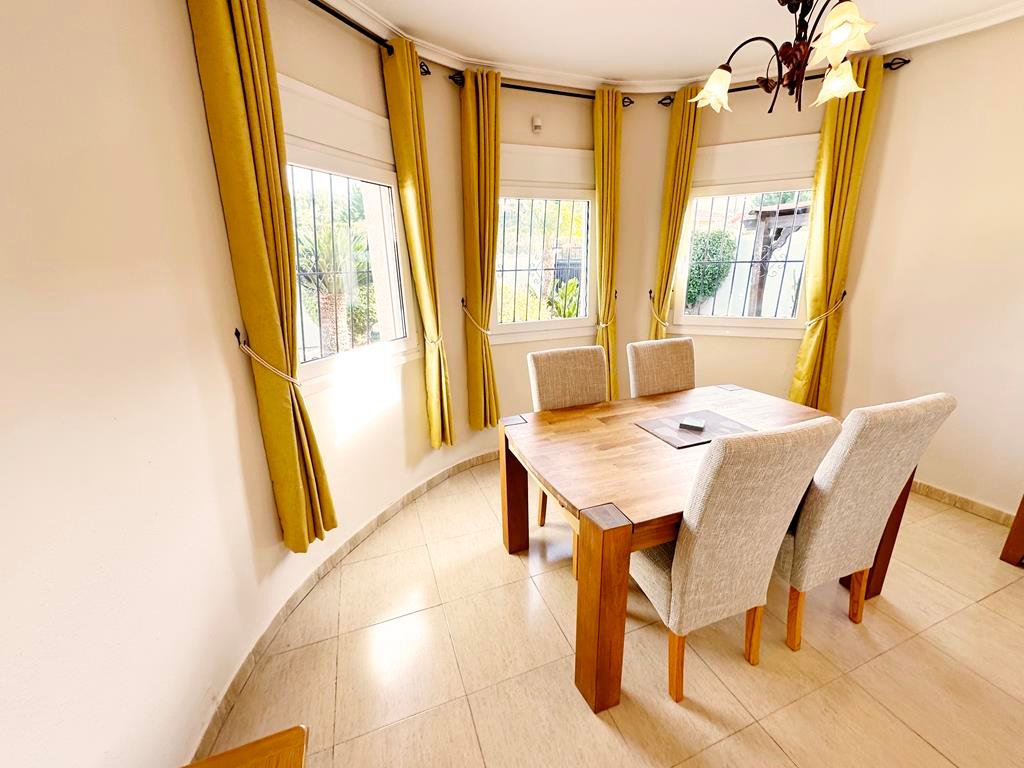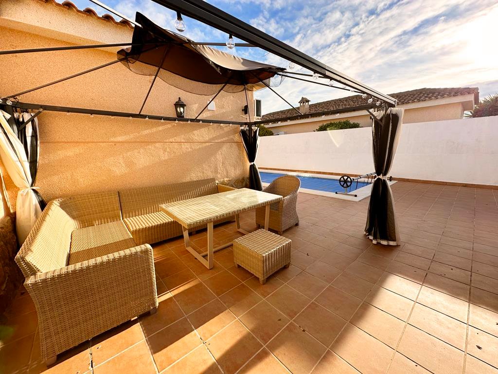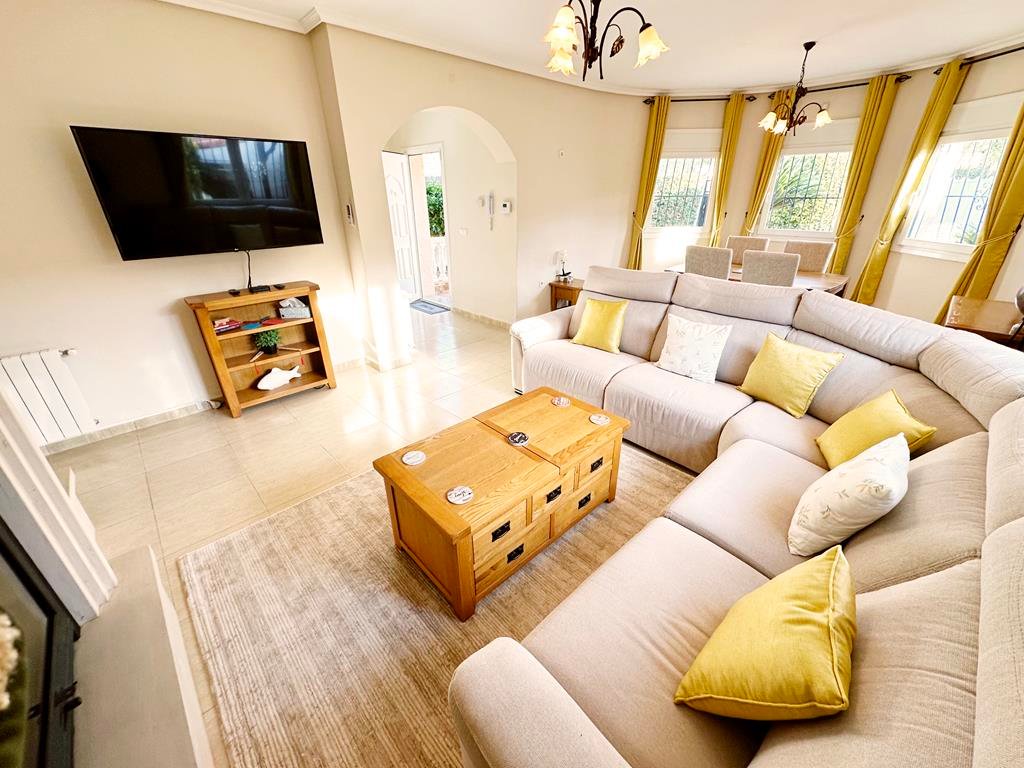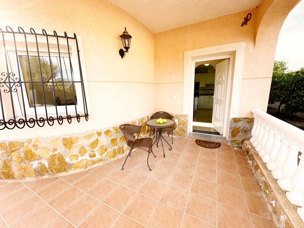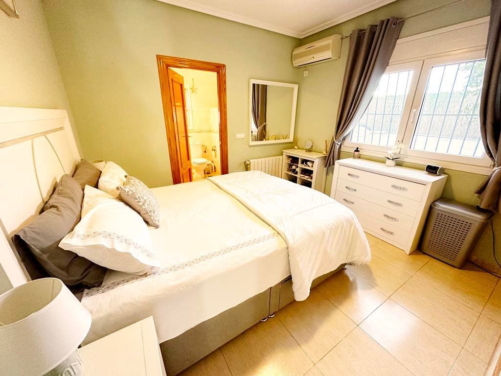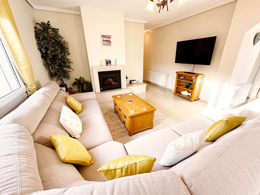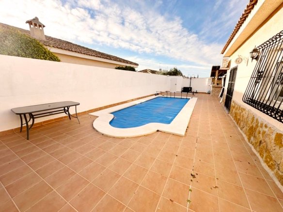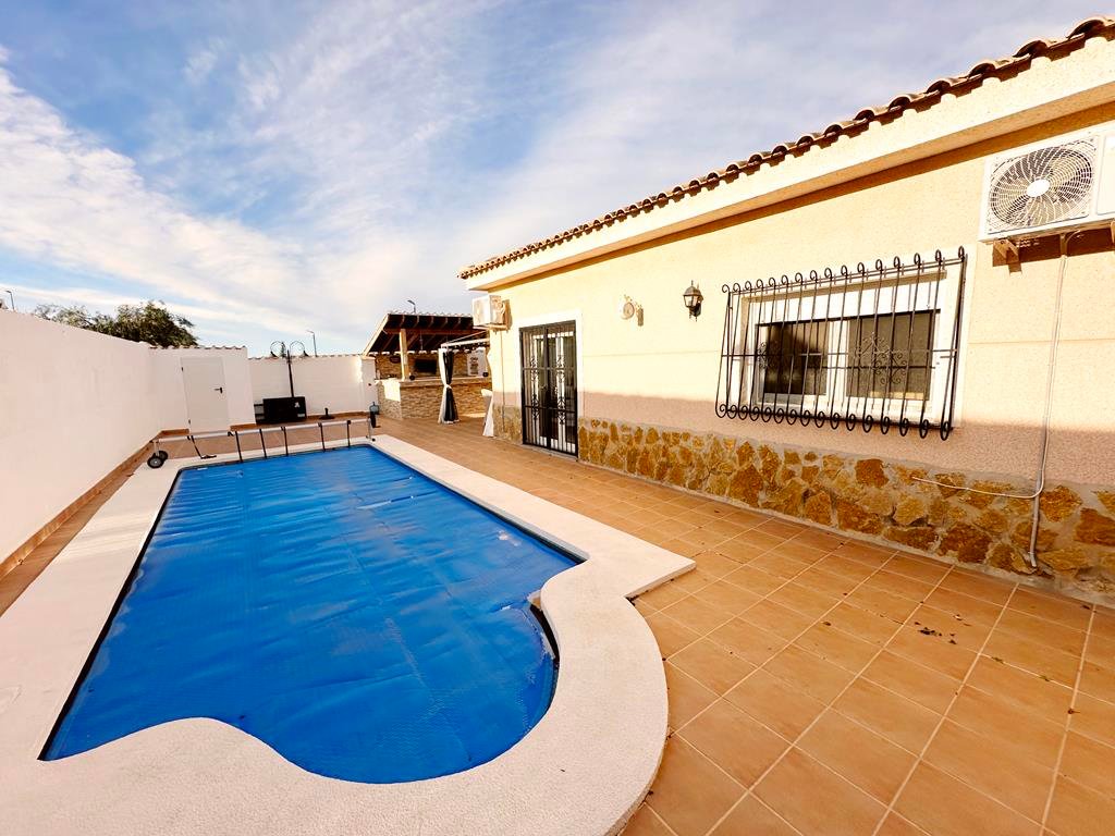 We are delighted to offer to market this gorgeous detached villa, on a large plot, on the Lo Santiago development. The development is a 20 minutes drive from Murcia City, Corvera airport and the beaches of the Mar Menor. A 5 minute walk on site is the fantastic New Yorks bar serving great food, a cafe and beauty salon. The urbanisation is surrounded by several wonderful golf courses, El Valle, La Torre, Altaona and Hacienda Riquelme.The villa is extremely private and accessed either by an electric gate onto the driveway or through a front gate. The villa is built on a large plot with gardens all around, with fruit trees, numerous seating areas, large private heated swimming pool (heater just installed) and fantastic bar kitchen area, perfect for entertaining. You enter the property into the hallway with the kitchen in front of you. This has been recently modernised with white units and built in washing machine and dishwasher and large American fridge freezer. To the left leads to the huge sunny lounge diner with built in log burner and views over the pool. The property does have aircon throughout and gas central heating. A hallway leads to three double bedrooms all with fitted double wardrobes, a guest bathroom and the master has an ensuite shower room. The 2nd guest bedroom has patio doors which open onto the pool area.