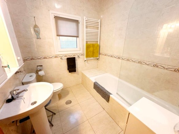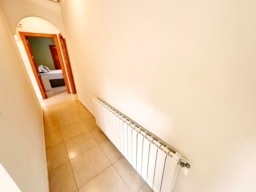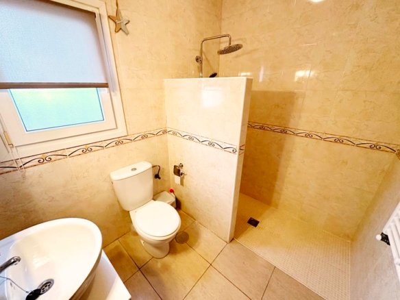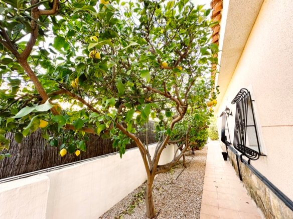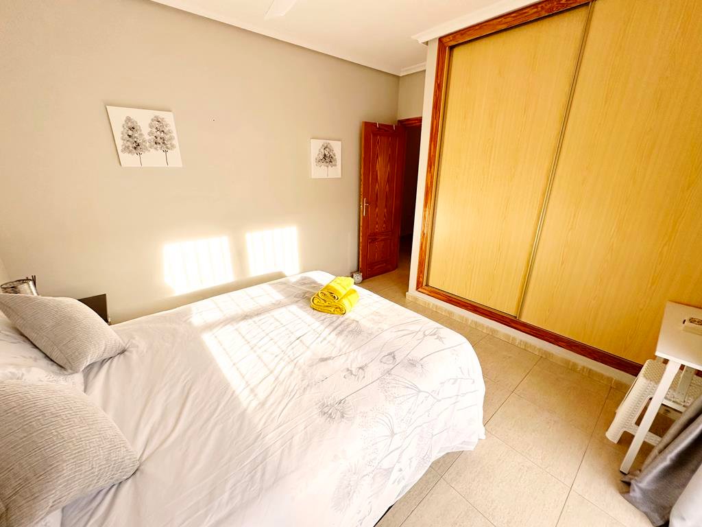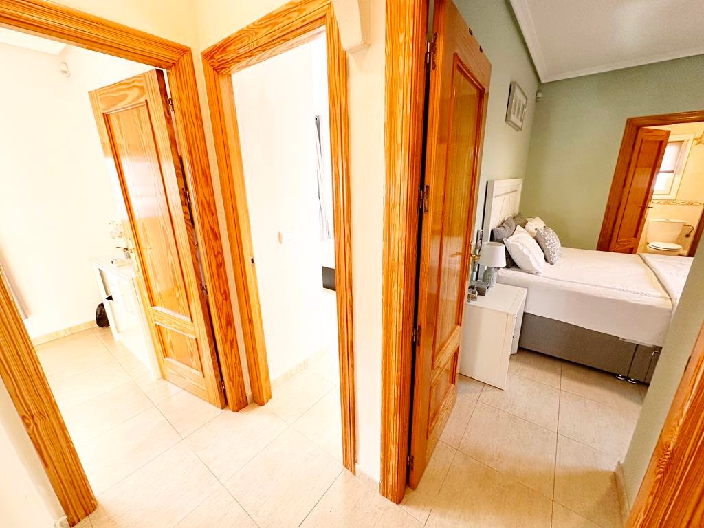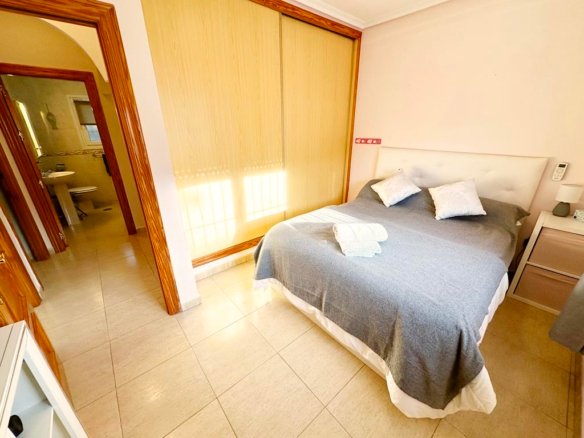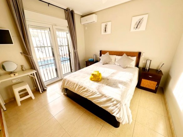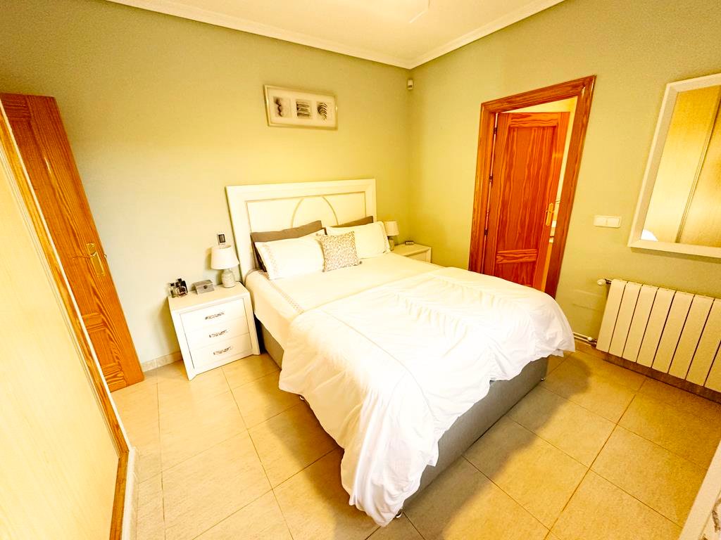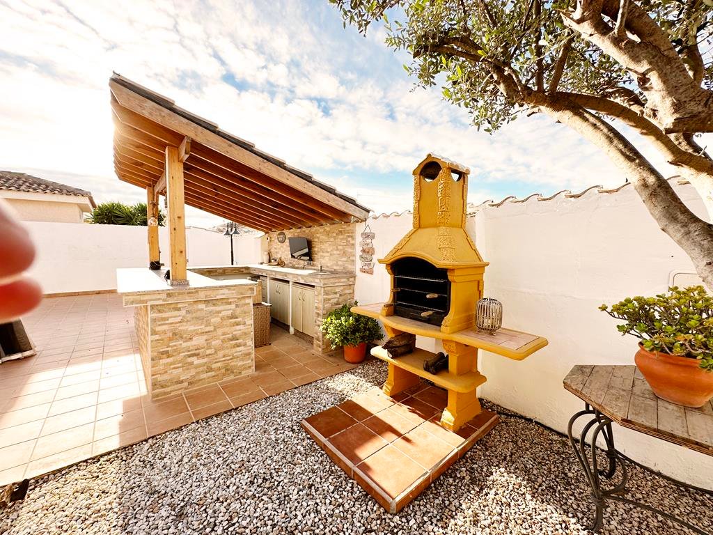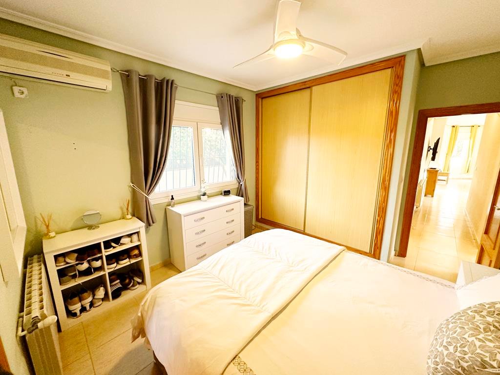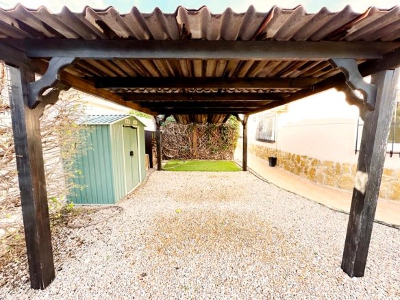 We are delighted to offer to market this gorgeous detached villa, on a large plot, on the Lo Santiago development. The development is a 20 minutes drive from Murcia City, Corvera airport and the beaches of the Mar Menor. A 5 minute walk on site is the fantastic New Yorks bar serving great food, a cafe and beauty salon. The urbanisation is surrounded by several wonderful golf courses, El Valle, La Torre, Altaona and Hacienda Riquelme.The villa is extremely private and accessed either by an electric gate onto the driveway or through a front gate. The villa is built on a large plot with gardens all around, with fruit trees, numerous seating areas, large private heated swimming pool (heater just installed) and fantastic bar kitchen area, perfect for entertaining. You enter the property into the hallway with the kitchen in front of you. This has been recently modernised with white units and built in washing machine and dishwasher and large American fridge freezer. To the left leads to the huge sunny lounge diner with built in log burner and views over the pool. The property does have aircon throughout and gas central heating. A hallway leads to three double bedrooms all with fitted double wardrobes, a guest bathroom and the master has an ensuite shower room. The 2nd guest bedroom has patio doors which open onto the pool area.