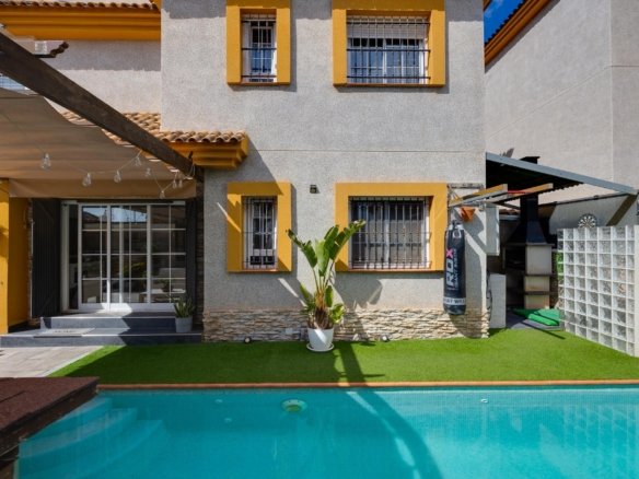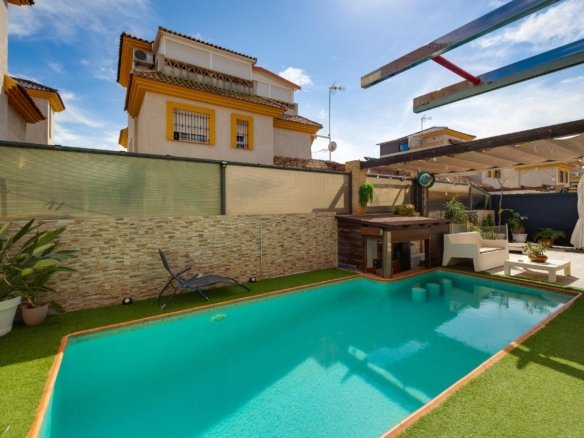 Discover this charming detached villa located in La Herrada, in Los Montesinos, a quiet residential area ideal for those seeking quality of life, privacy, and proximity to all amenities. It is also just a 10–15 minute drive from the beaches of Torrevieja and the city centre. The property stands out for its excellent condition and the care taken in every detail, making it a home ready to enjoy from day one. Upon entering the property, you are welcomed by a beautiful private garden with a swimming pool, the perfect space to enjoy the Mediterranean climate. The pool features strategically placed stools that create an original in-water bar area, ideal for sharing special moments. The outdoor area is completed with a barbecue area and a practical storage room. The villa is distributed over three well-designed floors. On the ground floor there is a spacious and bright living-dining room, very cosy and with direct access to the garden, creating a perfect connection between indoor and outdoor spaces. There is also a fully equipped independent kitchen, a double bedroom and a complete bathroom with a walk-in shower. On the first floor there are two bedrooms, one of them particularly spacious and including a practical office area. This floor also has a full bathroom with a walk-in shower. On the top floor there is a laundry area and access to a spectacular private solarium with stunning open panoramic views of the Pink Lagoon, a privileged place to enjoy sunsets and the natural surroundings. The property also features air conditioning, heating and is sold fully furnished and equipped, ready to move in and start enjoying from the very first moment. A unique property that combines comfort, privacy and a privileged location. CONTACT US!