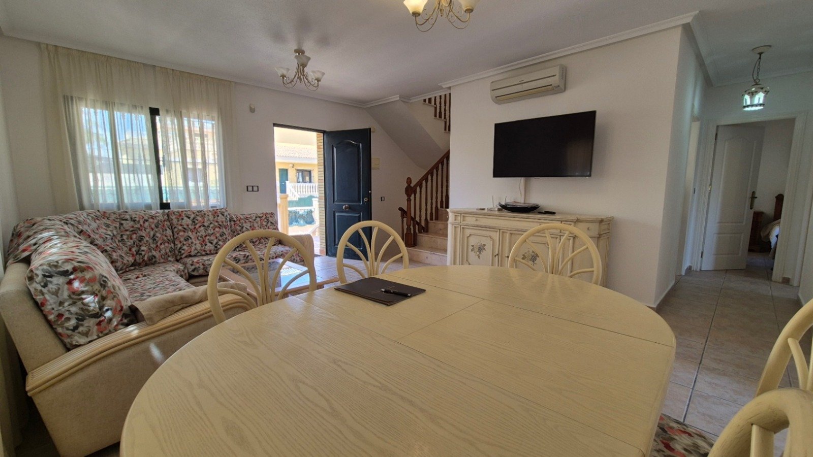 This beautifully presented south-facing detached villa offers the perfect blend of comfort, space, and privacy. Set on a generous plot, the property features three spacious bedrooms and two modern bathrooms, making it ideal for families, holidaymakers, or those seeking a peaceful permanent residence.Enjoy the sunshine all day long from the private swimming pool, set within a beautifully landscaped garden that provides plenty of space for outdoor living, entertaining, and relaxation. In addition to the private pool, residents also benefit from access to a well-maintained communal pool, perfect for socializing or cooling off in a larger setting.The villa also boasts a large garage, offering ample storage space or parking for multiple vehicles, with additional potential for a workshop or hobby area.With its south-facing orientation, the property enjoys abundant natural light throughout the day and pleasant views across the surrounding area. This charming home combines privacy and practicality in a desirable location — ideal for enjoying the Mediterranean lifestyle to the fullest.