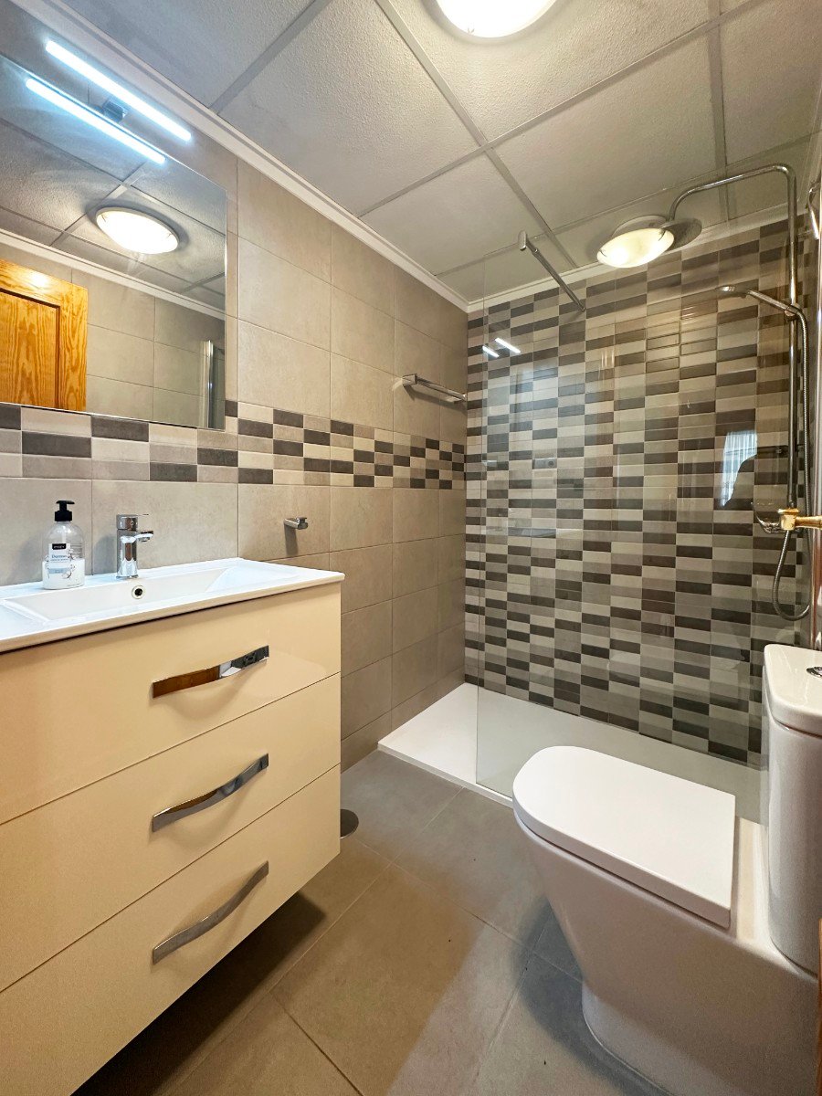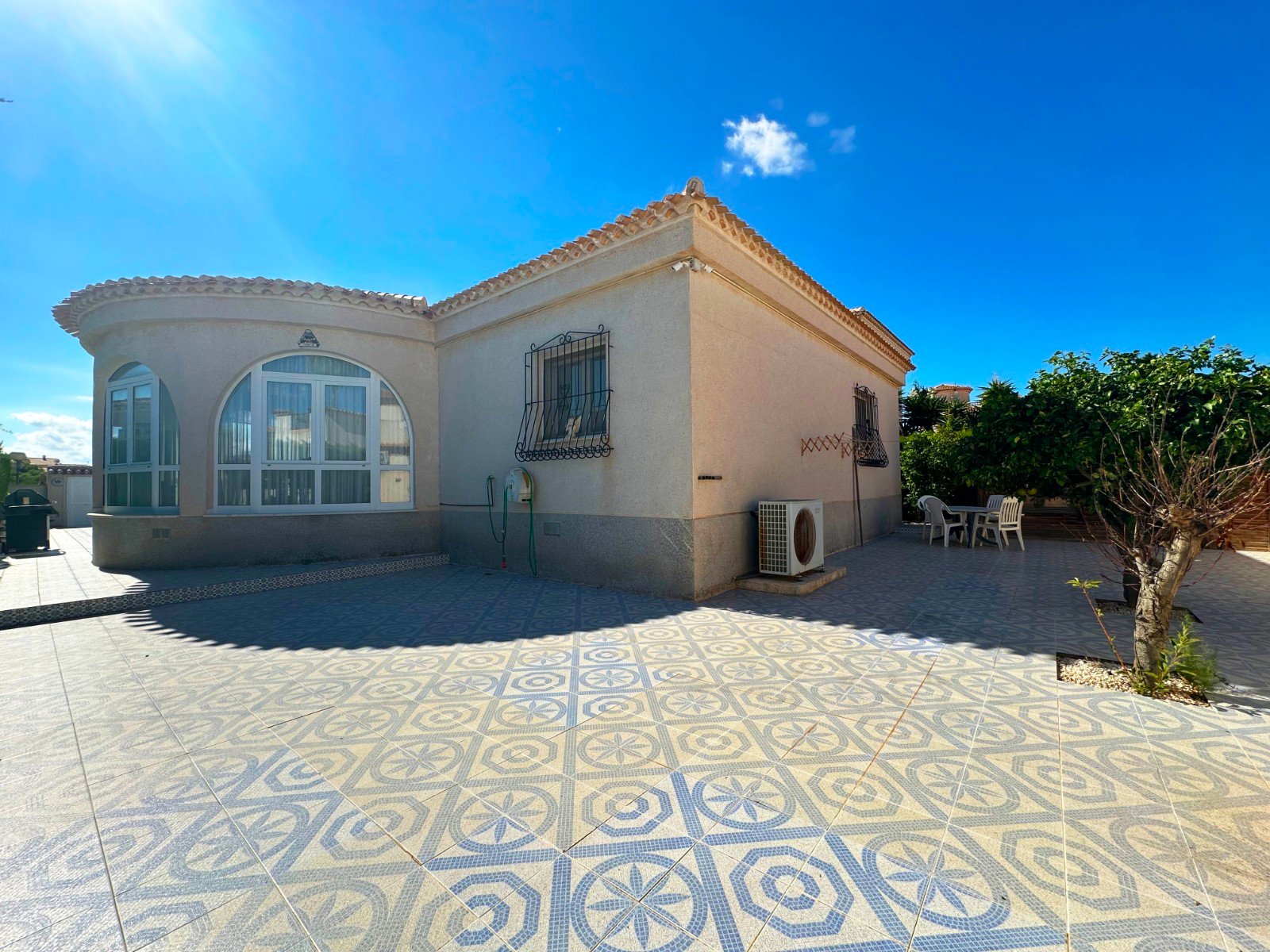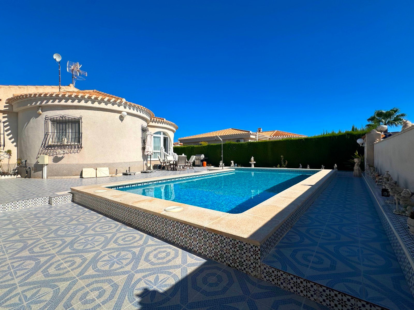 Your dream of a fully furnished, move-in-ready home surrounded by the beauty of Playa Flamenca – Orihuela Costa – is about to become a reality. Don’t miss out on your perfect opportunity! This Mediterranean-style villa offers the ultimate coastal lifestyle, located only minutes away from the golden beaches of the Mediterranean, the prestigious Villamartín Golf Course, and the famous La Zenia Boulevard. Orihuela Costa has it all: relaxation, adventure, or a mix of both. This mediterranean style family home has been meticulously designed for your comfort and features high-quality finishes and essential modern conveniences. It has everything you need for a hassle-free move. This stunning, tailor-made, fully furnished luxury villa with heated swimming pool offers the best lifestyle in a privileged setting. As soon as you step inside, you’ll be welcomed by a bright and welcoming atmosphere thanks to its south/west orientation that allows natural light to flood every corner. The villa is conveniently located on one level and boasts three spacious double bedrooms, perfect for resting and relaxing, as well as two bathrooms with walk-in shower. The master suite with a wall-to-wall wardrobe and ensuite bathroom offers a touch of sophistication, including underfloor heating for extra comfort. The separate kitchen, fully equipped with high-quality finishes, is a dream for food lovers and accesses perfectly with the dining room, creating the ideal space to share moments with family and friends. From the spacious living room and panoramic lounge area, with a bespoke snooker and dining table, american size fridge – freezer where you can enjoy a charming view of the pool and garden. This villa also includes many extras and a number of exceptional amenities: ducted air conditioning for personalized comfort, built-in wardrobes that optimize space, and additional in the back garden for extra storage, you enjoy a practical garden shed for convenience. Enjoy the perfect facilities for relaxing and staying active. The location is unbeatable, just 1,8 km from the beach and surrounded by services such as shopping centres, doctors, schools and parks, making it the ideal place to live.