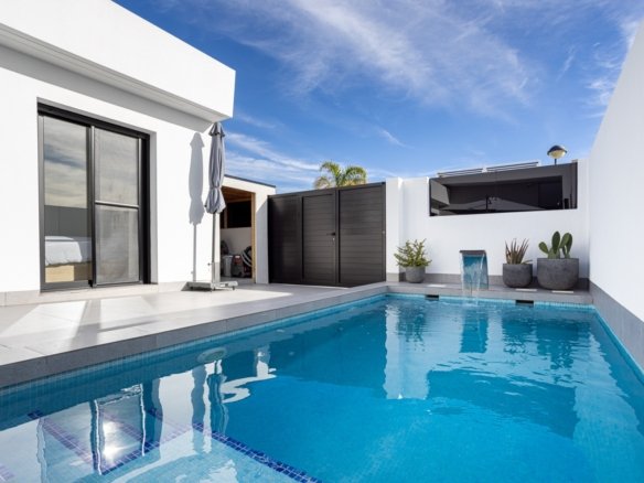This charming detached villa offers the perfect balance of comfort, privacy, and Mediterranean living, located in a quiet residential area of Torre-Pacheco, just minutes from all amenities. Built on a 151.71 m² private plot, the property has 85 m² of constructed space, all on one level, making it practical, accessible, and easy to maintain. The villa is designed to make the most of natural light thanks to its East orientation, ensuring bright interiors throughout the day. Inside, the home features three spacious bedrooms, all with built-in wardrobes, and two modern bathrooms, one of which is ensuite to the master bedroom. there is also a laundry and extra wardrobe area, very useful yet discreet. The open-plan kitchen flows seamlessly into the living and dining area, creating a welcoming and functional space ideal for both everyday living and entertaining guests. The property is in excellent condition, ready to move into, and is sold fully furnished, including appliances and air conditioning for year-round comfort. Outdoors is where this villa truly shines. The property boasts a private swimming pool, surrounded by a well-proportioned garden area, perfect for relaxing, sunbathing, or enjoying outdoor meals. A covered porch provides a shaded seating area, while the terrace and solarium offer additional space to enjoy the sun, entertain, or simply unwind with open views and privacy. There is a shade area upstairs on the solarium, along with an exterior kitchen, perfect for barbeques. The home also includes private parking within the plot and an intercom system for added security. Prime LocationBeaches: 20 minutesMurcia International Airport: 15 minutesLeisure areas, shops & restaurants: 5 minutesGolf courses: 5 minutes This property is ideal as a permanent residence, holiday home, or rental investment, thanks to its excellent location, outdoor space, and move-in-ready condition. A fantastic opportunity to enjoy the Costa Cálida lifestyle with comfort, sunshine, and privacy.