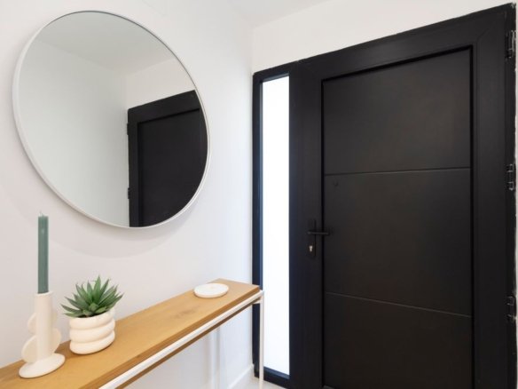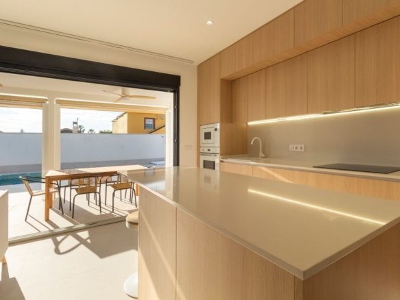 Semi-detached renovated villa for sale with swimming pool in a residential area of Torrevieja. This elegantly renovated villa stands on a plot of 289m2 with a private swimming pool, a tiled garden with various sun and seating areas and parking for the car with carport. The villa has all rooms on the ground floor and was completely renovated last year. The villa has 3 bedrooms, 2 bathrooms of which 1 is en-suite, a bright living/dining room and an integrated fitted kitchen with breakfast bar. At the living room lies a covered terrace with dining area and chill-out area. A/C. Sold furnished! Urb. El Chaparral is a quiet area around Torrevieja. Next to the natural park and just 4 km from the beaches of Torrevieja and La Mata, near all kinds of services, such as restaurants, bars, supermarkets, pharmacies, a water park and a public clinic. It is the ideal place for the whole year or to enjoy vacations.