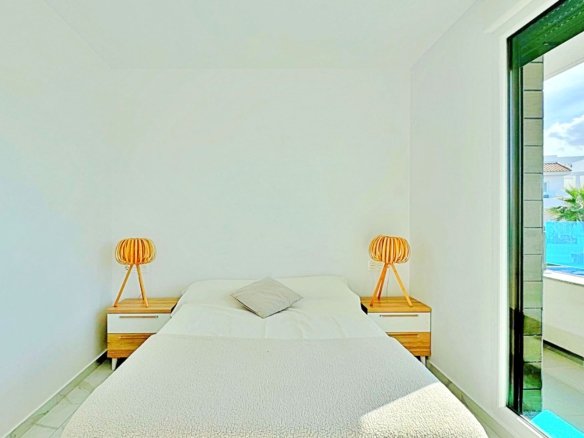 This three-bedroom, three-bathroom duplex townhouse is located in the exclusive residential area of Los Balcones in Torrevieja. The property stands out for its modern design, bright interiors and spacious terraces that allow you to enjoy the Mediterranean lifestyle all year round.On the ground floor, the house features a private 22 m² garden with space for outdoor dining. Inside, there is an open-plan living room with an elegant feature wall, connected to a fully equipped modern kitchen with appliances and breakfast bar. This level also includes a bedroom with fitted wardrobes, currently adapted as a study, and a complete bathroom with shower.Upstairs, there are two further bedrooms, both with fitted wardrobes. The master bedroom is particularly bright and has direct access to a private terrace with views of the residential area and the swimming pool. This floor also offers two additional bathrooms with modern finishes.The property also benefits from a large private solarium with open views of the Torrevieja lagoon, equipped with a chill-out area, pergola, barbecue and sun loungers — perfect for outdoor gatherings or simply relaxing in a peaceful setting.The residential complex offers large communal areas with a swimming pool surrounded by palm trees and green spaces, creating an ideal environment for families or those seeking a relaxed lifestyle.Los Balcones is one of the most established residential areas of Torrevieja, with all services nearby: supermarkets, schools, pharmacies, sports facilities and Torrevieja University Hospital. The beaches of Punta Prima and Torrevieja are less than 4 km away, making this property an excellent choice both as a permanent residence or a holiday investment.