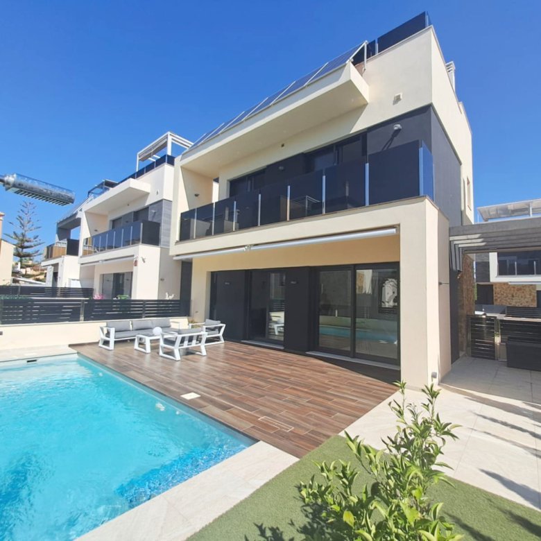 We present a 240 m2 duplex in a modern style in a closed complex in the town of Finestrat.Finestrat is a cozy urbanization with sea views just seven minutes north of Benidorm, three minutes to the shopping center, supermarkets, as well as theme parks with attractions and exotic animals – all unique characteristics of Finestrat. Just a five-minute drive away is Cala Finestrat beach – quiet, cozy, with golden sand and coastal restaurants serving Mediterranean cuisine. Nearby are golf courses.The first floor features a large open-plan kitchen, living-dining room, and hall with large glass doors leading to the garden. On the second floor, there are three bedrooms with access to large terraces (one with sea views and electric awnings). Two bathrooms with shower and heated floors, and a hall that can be used as a study, with a built-in wardrobe and a glass door leading to one of the terraces.Camporosso Village Residence complex features two swimming pools, a gym, sauna, children’s playground, and manicured gardens – providing everything you need to enjoy outdoor living! A great option for renting out!This property can be purchased online without visiting Spain, with financing from a bank at 3-6% interest. Buying property in Spain allows you to obtain Spanish residency. Our company assists in obtaining all types of residency permits.