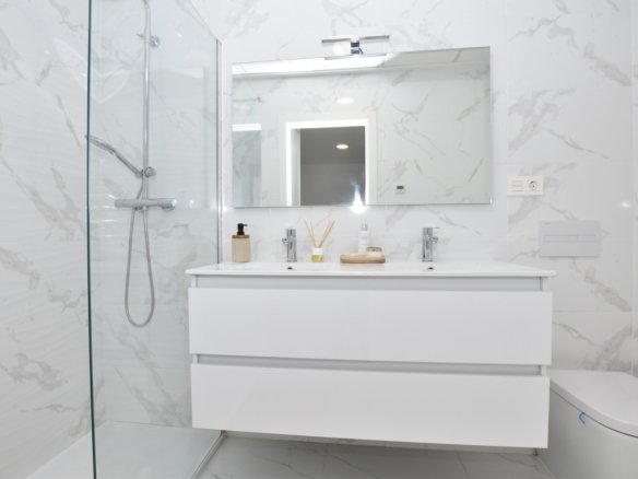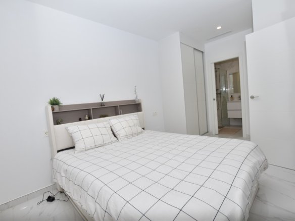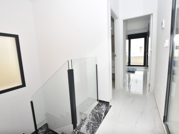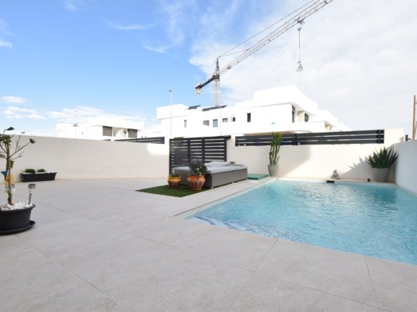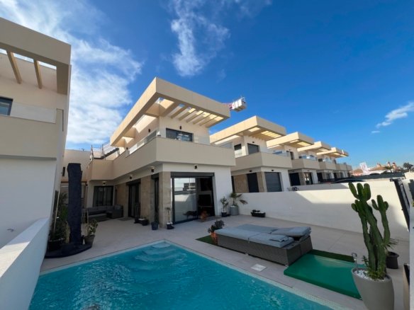 This modern detached villa, completed in 2025, is located in the well-established residential area of La Herrada, Los Montesinos. The property offers contemporary design, comfort, and a highly desirable location on the Costa Blanca. Upon arrival, the villa impresses with its clean architectural lines, private swimming pool, and off-road parking, providing both privacy and convenience. Inside, the home features a bright and spacious open-plan living area combining lounge, dining space, and kitchen, creating an inviting environment suitable for both everyday living and entertaining. A guest cloakroom is also located on this level. The master bedroom is situated on the ground floor and benefits from walk-through wardrobes and an en-suite shower room, making this layout ideal for those seeking main living accommodation on one level. Upstairs, there are two double bedrooms, both with built-in wardrobes and excellent natural light, along with a modern family bathroom. A generous terrace is accessible from this floor, offering additional outdoor space. From the terrace, external stairs lead up to the private rooftop solarium. This area provides open views across the surrounding countryside and both salt lakes, offering an ideal setting for sunbathing, relaxing, or outdoor dining. The villa is sold with most of the furniture included and is fully air conditioned throughout, allowing immediate enjoyment. The location is particularly convenient, with a local supermarket, bars, and restaurants within a five-minute walk. The beaches of Guardamar del Segura and Torrevieja are approximately fifteen minutes away by car, while Vistabella Golf is just a ten-minute drive.