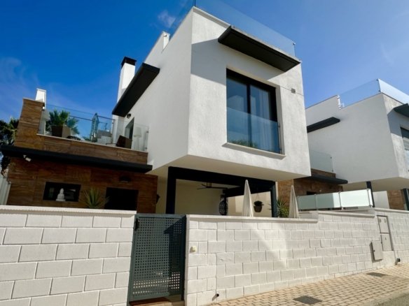 Welcome to your dream home in the heart of Lomas de Cabo Roig, one of Orihuela Costa’s most desirable residential areas. This stylish and well-maintained detached villa is ready to move into, offering a perfect blend of comfort, modern living, and Mediterranean charm. Whether you’re looking for a permanent residence, a luxury holiday escape, or a high-return investment, this property delivers on all fronts. Why This Villa Stands Out: Spacious and Bright Interiors The villa spans two levels with 128 m² of living space. It features an open-plan living and dining area, a fully equipped contemporary kitchen, and three large bedrooms, including two with en-suite bathrooms. All bedrooms come with built-in wardrobes and ample natural light. Exceptional Outdoor Living Set on a 189 m² private plot, the home offers a private swimming pool, a large rooftop solarium with open views, and a fully tiled terrace with BBQ, lounge furniture, and dining area — perfect for sunbathing, entertaining guests, or relaxing with family. Optimised Orientation South-east facing front patio and south-west facing terrace and pool area provide all-day sunlight. The property also includes air conditioning and individual heating in every room, ensuring comfort throughout the year. Prime Location Located in a quiet and well-established urbanisation, you are just a short drive from the beaches of Orihuela Costa. Daily conveniences including supermarkets, restaurants, shopping centres, golf courses, and schools are all nearby. Property Summary: 3 bedrooms, 3 bathrooms 128 m² built, 189 m² plot Private pool, rooftop solarium, tiled terrace with BBQ Built in 2018, excellent condition Air conditioning and heating throughout Quiet setting, close to all amenities This villa offers the ideal combination of style, comfort, and location. Whether you want to live here year-round, enjoy it as a holiday home, or rent it as an investment, it’s a smart choice on the Costa Blanca. Book your private viewing today — this opportunity won’t last long.