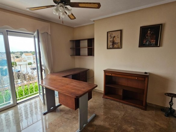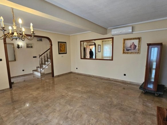 Spacious 3-bedroom house with 3 bathrooms, built on a 420 m² plot, featuring a separate garage, private pool, and solarium. The house includes: – Large office for work or study – Walk-in wardrobe in the master bedroom – Separate kitchen with a spacious laundry room and access to the pool – Semi-basement – equipped storage room – The house is located in a quiet residential area of villas in El Chaparral, Torrevieja, Alicante, Spain. House Features: – Total area: 267 m² + garage with automatic gates – Year of construction: 2002 – Living room: 25 m² – Bedrooms: 3 separate + office on the second floor – Bathrooms: 3, including a jacuzzi bath – Master bedroom: with a large balcony and separate walk-in wardrobe – Materials & finishes: marble staircase with wrought iron railings, underfloor heating throughout the house, air conditioning – Solarium: spacious with panoramic views of the Torrevieja Salt Lakes – Utilities: gas boiler for underfloor heating, partially fitted appliances and furniture This house is perfect for a family that values comfort, privacy, and space on the sunny Spanish coast.