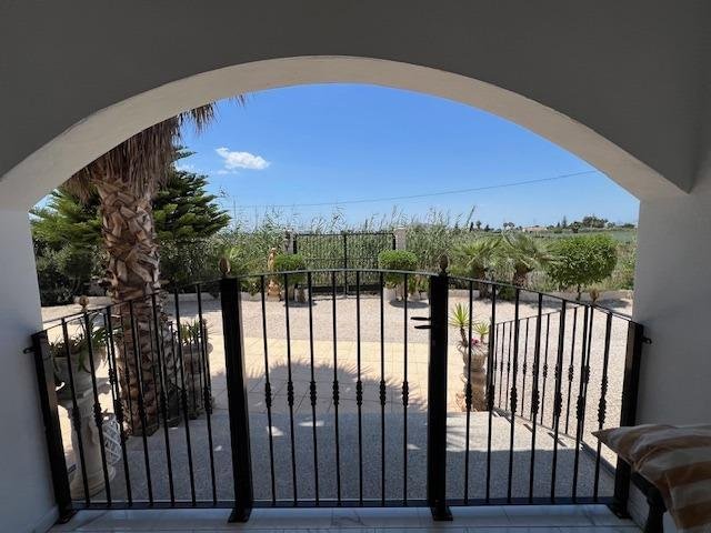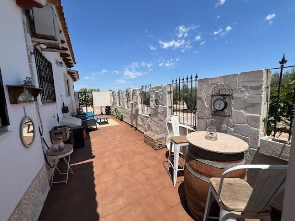 Discover the perfect blend of rural charm and modern living in this impressive detached property located in the countryside of Dolores. The property benefits from a secluded, gated location, including a luxurious private swimming pool and outdoor barbeque area. Five beautiful marble steps lead to the impressive entrance, with a high security front door. Once inside there is a welcoming hall with security lighting and a fitted mirror fronted wardrobe, providing excellent storage. There are 3 generously sized bedrooms: Two double and one mezzanine style single. All bedrooms have ample wardrobe and storage space. Additionally each boasts its own unique and beautifully styled and furnished en suite bathroom. There is an additional fourth family shower room for further comfort. The wonderfully spacious open plan living area has a spectacular lounge and dining area, with outstanding natural lighting and views to the stunning gardens and surrounding countryside. There is a wood burning stove for the winter months. The kitchen is fully equipped with a range of base and wall units and marble surfaces. The island integrates an electric oven and there is a gas and electric hob. A large American style fridge freezer and washing machine complement the space. The exterior of the property is just as impressive with its large and charming mature gardens of palm and olive trees in addition to tastefully placed floral bushes to enhance the privacy. There is a large terraced area leading from the lounge dining area and 2 further balconies. Once outdoors the spacious outdoor dining patio complements the barbecue area, with a further tiled courtyard. The property has air conditioning heating units in the living area and bedrooms.