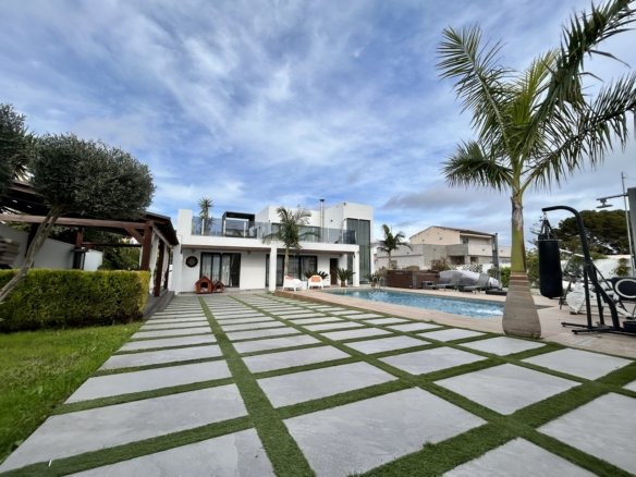 Step into pure luxury with this stunning 3-bedroom, 4-bathroom villa in the prestigious residential area of Los Balcones, set on an impressive 1,000 m² plot and designed to deliver true wow-factor living inside and out.From the moment you arrive, the property makes a statement with a large private driveway accommodating multiple vehicles, beautifully framing the home’s elegant façade and expansive outdoor spaces.As you enter, you’re greeted by a stylish welcome area — the perfect setting to host friends and family for drinks before dinner. This flows seamlessly into a refined dining area and a contemporary open-plan kitchen with island, ideal for social cooking and entertaining. From here, you have direct access to the rear terrace, where lush greenery creates a tranquil backdrop for outdoor dining and relaxation.The first level features a spacious living room, a utility room, and a generously sized bedroom with extensive wardrobe space and its own en-suite bathroom. An additional bathroom on this level ensures convenience for guests and everyday living.Upstairs, a dedicated gaming and leisure area opens onto a large, sun-drenched terrace — a perfect retreat for relaxation or entertaining under the Mediterranean sky. This level also hosts two further bedrooms and two bathrooms, offering comfort and privacy for family and guests alike.The exterior of the property is designed for year-round enjoyment:Private swimming pool for cooling off in styleJacuzzi area for ultimate relaxationCovered seating area providing shade on hot summer daysExpansive grounds offering privacy and spaceThis remarkable villa blends luxury, space, and lifestyle in one of the Costa Blanca’s most desirable locations, close to amenities, golf courses, and the coastline.An extraordinary home for those who expect nothing but the best.