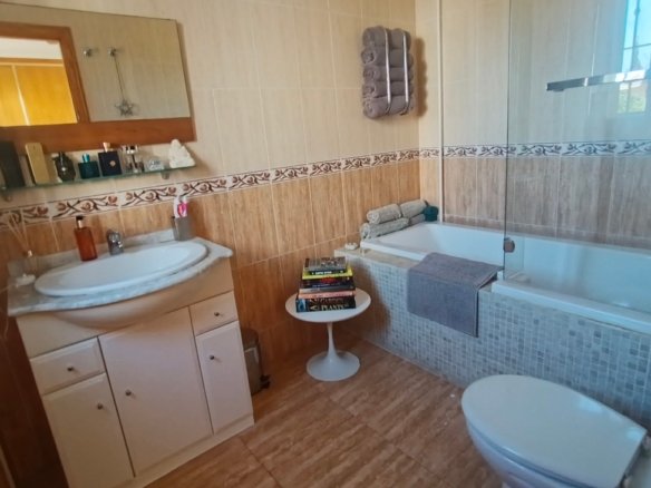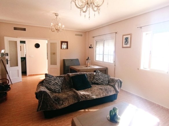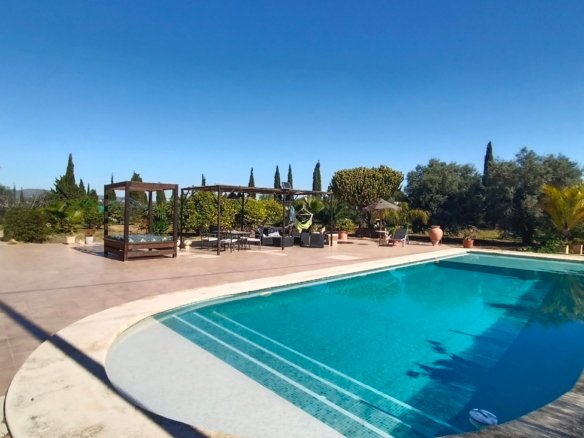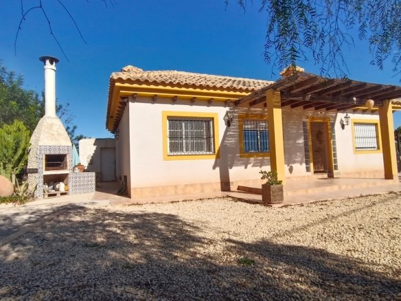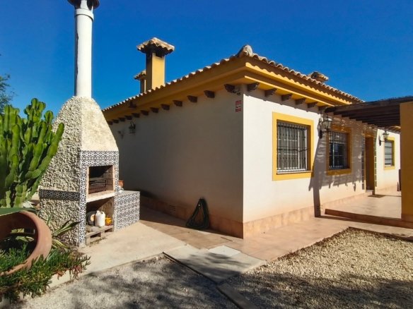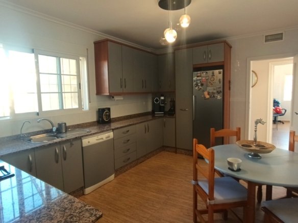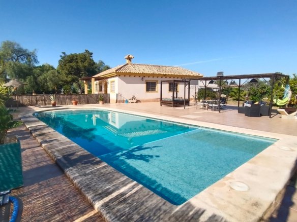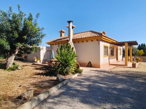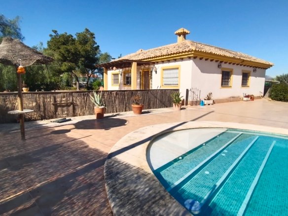 Spacious Country Villa Within Walking Distance to Village AmenitiesThis unique and spacious country villa offers the perfect blend of peaceful rural living and everyday convenience. Set amongst beautiful countryside with views and established orchards, the property enjoys the rare advantage of being within walking distance of a traditional Spanish village offering all amenities, including supermarkets, school, medical centre, cafés, and sports facilities.Built around 2008 and constructed to a high standard, the villa is generously proportioned and laid out entirely on one level, making it ideal as a family home, holiday retreat, or retirement property.The gated entrance opens onto a private driveway. To the left, there is a substantial concrete area which offers multiple possibilities — ideal for additional parking, recreational use, sports area, or potential construction of outbuildings (subject to permissions). To the opposite side of the villa lies the extensive swimming pool and an impressive terrace area of approximately 300m², surrounded by beautifully landscaped grounds — perfect for entertaining and enjoying outdoor living.The property is entered via the front terrace into a welcoming hallway.To the left is an expansive living and dining room, filled with natural light and enjoying views to the front of the property. This impressive space comfortably accommodates large gatherings and features a wood-burning stove, creating a cosy atmosphere in the cooler months. The whole house has fully integrated air conditioning throughout.To the right of the hallway is the bedroom wing:A single bedroom, currently used as an office.A small double bedroom, presently arranged as a children’s room, with bed and ample storageA further double bedroom with double bed, generous storage units, and views towards the terrace and poolThe spacious master bedroom with ensuite bathroom, complete with shower, WC and vanity unit, plus excellent storage spaceReturning to the left of the hallway beyond the living room is the large fully fitted kitchen. This bright and well-appointed space features granite worktops, modern grey units, and ample room for a dining table and chairs. The kitchen overlooks the rear patio and offers plenty of space for family living.The kitchen leads to a separate utility room housing the washing machine, dryer, and boiler. From here, access is provided to a private interior courtyard — a charming sun trap ideal for outdoor dining, relaxation, or practical use.From the courtyard there are two additional storage areas, one of which could potentially be converted into a guest annex apartment. A stairwell from this courtyard leads up to the roof terrace/solarium, where panoramic countryside views can be enjoyed in complete privacy.Location is key:Just a few minutes’ walk to the village centre with all amenitiesApproximately 20 minutes’ drive to the coast20 minutes to the airport25 minutes to Murcia cityThis is a substantial, versatile property offering space, privacy, and convenience in equal measure. Early viewing is highly recommended