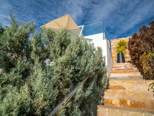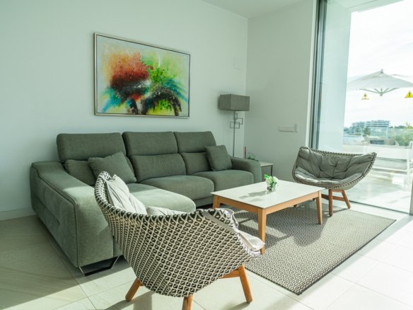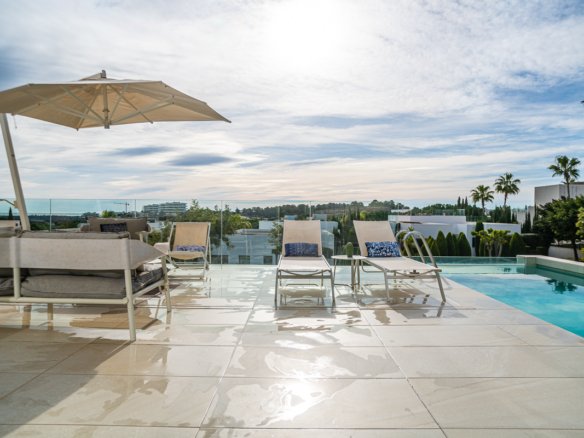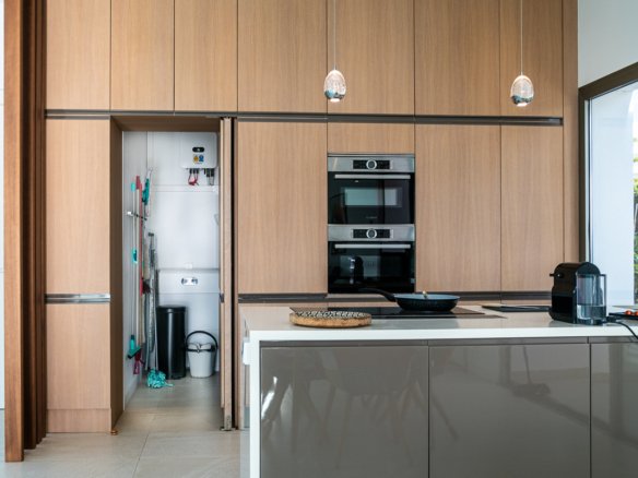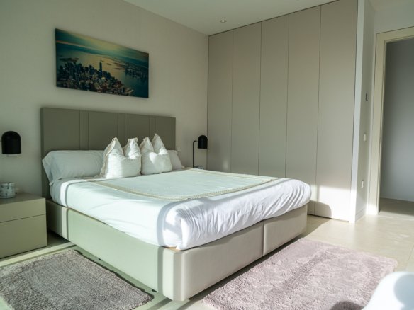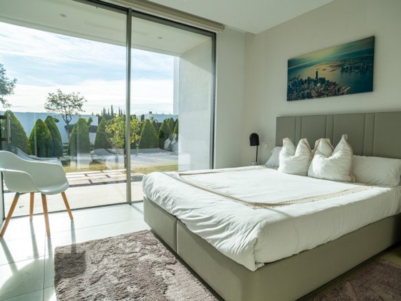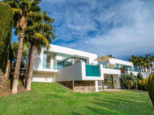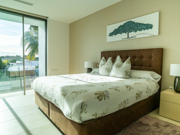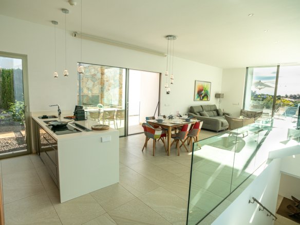 This luxury villa is located at Las Colinas Golf & Country resort located near Campoamor and the village of San Miguel de Salinas, 70 km south of Alicante. The golf resort is 330 hectares big and has besides the golf course a private beach club on the beach of Campoamor, a communal swimming pool, paddle fields, a fitness, tennis court, 2 nature trails and a mini supermarket. There are 3 restaurants: An Italian restaurant, a sushi restaurant and a club house with golf shop and changing room with showers. The entire domain is secured with its own security with camera surveillance at the entrance. The villa is located in the Limonero community which has direct access to the golf course. In front there are 2 private parking spaces and a beautiful front garden. Through the front door you enter the large living space with open kitchen, dining area, living room and a separate toilet with sink. The kitchen has all the necessary facilities and appliances (convection oven, dishwasher, microwave, fridge, 4 ceramic hobs and an air extraction system). Behind the kitchen there is a storage room with the necessary connections for the washing machine and dryer. Next to the kitchen there is a terrace with a table and chairs and a fireplace that is accessible through a sliding window. Through a glass walkway over the pool you enter the master bedroom with spacious built-in wardrobes and with private bathroom. Through the sliding window and the terrace at the bedroom you have direct access to the private pool. The large bathroom has a jacuzzi bath, a toilet, large walk-in shower and bathroom furniture with sink. Through the living space you can open the sliding windows completely so that you have direct access to the large terrace with a view of the golf and the sea. Through the terrace you can directly into the private pool that is located under the footbridge over the entire length of the house and can be beautifully lit in the evening. There is a BBQ area that can also be equipped with an outdoor kitchen and a shower. With the stairs up you come to the sun terrace with panoramic views over the golf with a view of the sea. On the ground floor there are 2 bedrooms with double bed and built-in wardrobes with sliding windows that have direct access to the terrace below and the large garden. There is also a bathroom with walk-in shower, toilet, bathroom furniture and sink. In addition, there is a large recreational room (mancave) and there are two large storage rooms where the technical installations for the swimming pool and the heat pump are located. The villa has all the necessary amenities: solar panels, air conditioning, alarm system, home automation system, internet and wifi. The house is sold including the furniture, but excluding the patio furniture and a few typical African pieces of furniture.