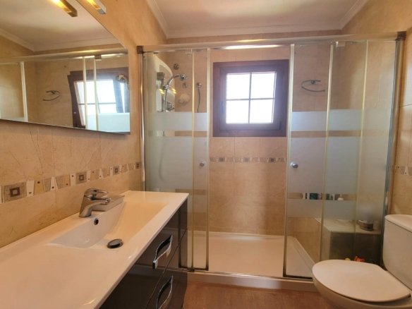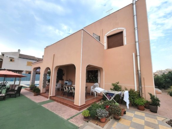 Magnificent rustic-style villa, completely independent, about a 15-minute walk from the beautiful beach of La Mata! It consists of a large porch at the entrance of the house, a Summer sitting room, a dining room, another sitting room, a large and fully equipped separate kitchen with a fireplace, a double bedroom with an en-suite bathroom with an Italian shower and a guest toilet. The upper floor consists of a hall, three double bedrooms (one with a balcony and a small terrace), a bathroom with an Italian shower and a terrace with a sink, washing machine, … From this terrace, you can access the solarium with clear views. All located on a large plot with a private swimming pool, gardens, trees, terraces, a pergola, a built-in barbecue, a separate utility room with a small kitchen and storage area (which can be converted into a guest bedroom or other) and a closed garage. Furnished. Underfloor heating in the whole ground floor and heating with radiators in the upper floor. Built-in wardrobes in the bedrooms. Solar panels. Plenty of light with many windows in the whole house. A true luxury! Close to all amenities, supermarkets, a small shopping center, restaurants, cafes, etc., about 900 meters from the beach of La Mata.