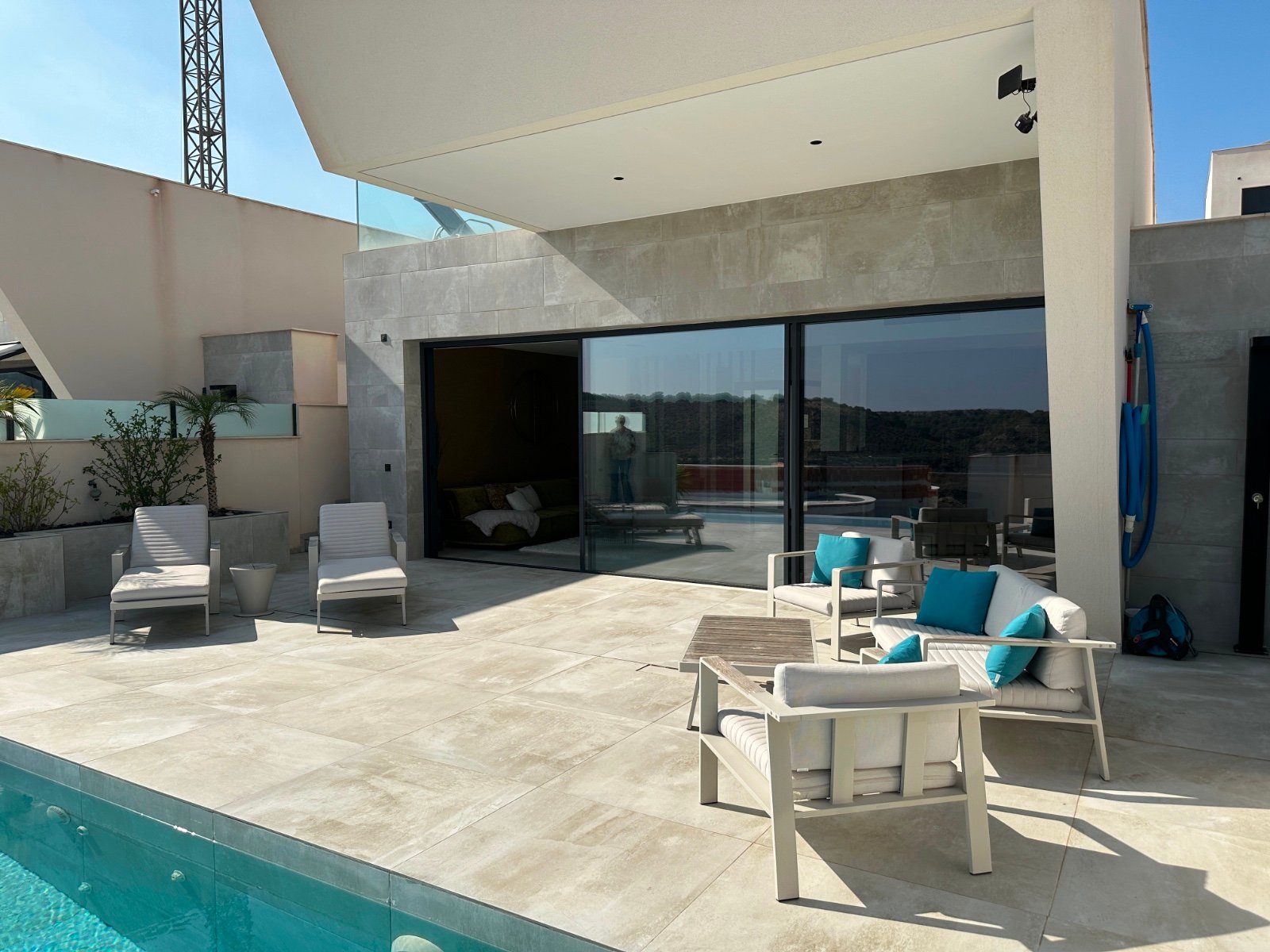This villa is designed to embrace the breathtaking views of the Mediterranean Sea and the skyline of Guardamar del Segura. Located in an area steeped in stunning vistas and the tranquil essence of the Mediterranean lifestyle, this property offers a harmonious blend of natural beauty and modern luxury. Just minutes away from the vibrant town of Rojales and the La Marquesa golf resort, this villa represents the perfect marriage of contemporary design and its splendid surroundings. Highlights of the Villa: Two En-Suite Bedrooms: Both bedrooms feature terraces, providing an oasis of peace and serenity.Infinity Pool: Enjoy the stunning views while you relax in the infinity pool.Space and Light: The ground floor is flooded with natural light and includes 2 bedrooms, a bathroom, a garage, and a fitness studio you’ve always dreamed of. There is also a laundry room with a washer and dryer.Living Space: Here, you have the opportunity to customize your living space to your needs and desires while staying connected to the beautiful surroundings this region has to offer. Immediately Available: This villa is move-in ready and is sold fully furnished, including the fitness room! This is your chance to enjoy the magic of the Costa Blanca South, where every day offers a new opportunity to experience the beauty of the Mediterranean Sea. Welcome to your own piece of paradise. Book your viewing soon and discover the unique charm of this beautiful villa.