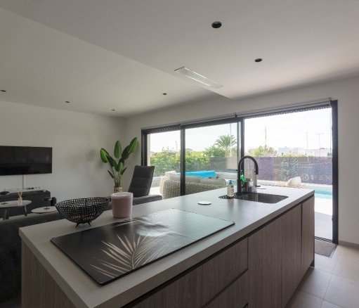 luxury villa with 4 bedrooms and elevator. This beautiful dream villa in Los Montesinos on the Costa Blanca, where luxury and space offer an unparalleled living experience. This detached villa with private garden offers considerably more space than comparable properties on the market, making it a unique opportunity for those seeking comfort and space.Upon entering the villa, you will find a hall with a wardrobe. To the left is the dining and living room, which also features a spacious open kitchen with a beautiful view of the pool and covered terrace where you can enjoy warm summer days. The kitchen has a very large refrigerator and freezer, which is neatly concealed. There are two combination ovens with microwave, induction hob, dishwasher, in short, everything you need. Large windows provide plenty of natural light and create a warm and inviting atmosphere. Behind the kitchen is the laundry room. On the ground floor, there are three spacious bedrooms and two bathrooms, one of which is en suite. All bathrooms have underfloor heating. This beautiful villa has an elevator with a telephone, making every floor easily accessible for everyone. The house is also wheelchair friendly.On the first floor, there is another very spacious bedroom with an en-suite bathroom and a dressing room. There is also a storage room with a safe. From the bedroom, you have access to the 40 m² solarium with views of the private terrace and the surrounding area, including the salt lake of Torrevieja.The basement features a spacious 45 m² living room, a storage room, and an 84 m² garage with ample space for several cars.This luxury villa has been built with high-quality materials and offers durability, elegance, and maximum energy efficiency. Hot and cold air conditioning is available throughout. The villa has 14 solar panels. The spacious indoor and outdoor areas set this property apart from the competition, allowing you to enjoy your new home to the fullest.Within walking distance of the supermarket, restaurants, and bars. In Los Montesinos, you will find the beautiful square next to the town hall, where you can soak up the authentic Spanish atmosphere. A short drive takes you to Torrevieja, Ciudad Quesada, or the beautiful sandy beaches of La Mata.
