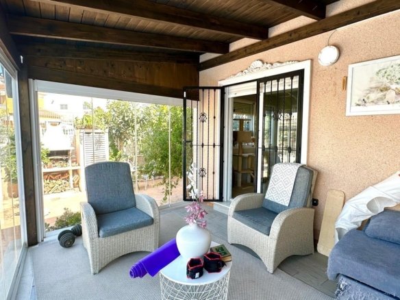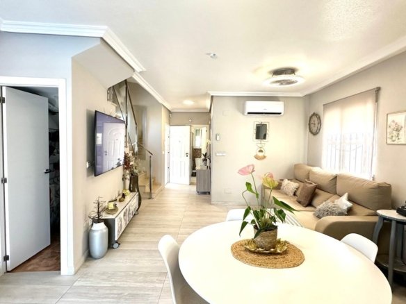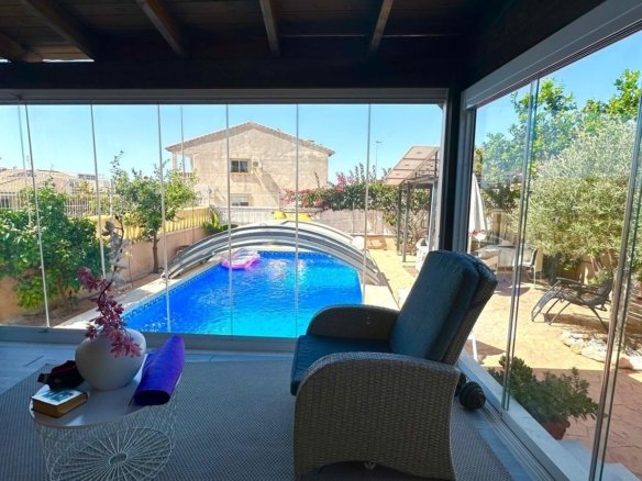 Detached Corner Villa with Private Pool and Solarium – Just 1 km from the Sea We present this magnificent property located in an exclusive residential development just one kilometer from the coast. This detached corner villa offers privacy, comfort, and an excellent quality of life, both as a primary residence and as a second home near the sea. Layout and Outdoor Spaces With a 200 m² plot and 119 m² built area, this home is spread over three floors, maximizing space and functionality. The property has vehicle access and parking within the plot, as well as its own private pool, all surrounded by a well-maintained garden and terraced areas ideal for enjoying the outdoors. Furthermore, it is part of a development that also offers a communal pool, providing more leisure options without leaving the surrounding area. First Floor: Common Areas and Amenities Upon entering the home, we are welcomed by a glass-fronted hall that provides light and spaciousness from the first moment. On this floor, you’ll find a modern full bathroom, a contemporary kitchen fully equipped with quality appliances, an additional pantry, and a spacious and bright living and dining room. From the living room, you can access a glazed terrace with direct views of the private pool and garden, creating a perfect setting for family gatherings or relaxing moments. Second Floor: Lounge Area Upstairs, you’ll find three double bedrooms, all with built-in wardrobes. The master bedroom has its own en-suite bathroom, ensuring privacy and comfort. There’s also a second full bathroom serving the other bedrooms. Third Floor: Solarium and Storage Room The third floor houses a practical storage room and a large private solarium, ideal for sunbathing, a chill-out area, or even a small urban garden. From here, you can enjoy unobstructed views and a peaceful setting. Extras and Energy Efficiency The home is equipped with air conditioning in all rooms to ensure maximum comfort year-round. In addition, it has solar panels already installed, which contributes to more efficient energy consumption, significantly reducing electricity costs and promoting a more sustainable lifestyle. Features at a glance: Detached corner villa 200 m² plot 119 m² built area Private and communal pool 3 floors 3 bedrooms with built-in wardrobes 3 bathrooms (1 en suite) Independent, fully equipped kitchen Living/dining room + glazed terrace Storage room and private solarium Air conditioning in all rooms Solar panels for self-consumption Parking within the plot Only 1 km from the sea A perfect home for those seeking space, privacy, and a peaceful setting with all amenities nearby and the sea just minutes away. Would you like to schedule a viewing or receive more information? We are at your disposal.
