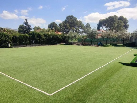 A Truly Unique Villa with Pool, Sports Facilities & Panoramic Views – Just Minutes from SaxWe are very proud to introduce this must-see 4-bedroom, 3-bathroom villa—a stunning blend of traditional Spanish charm and modern comforts, set in a peaceful location with breathtaking views, just 4 minutes from the historic town of Sax and 35 minutes from both the beach and Alicante airport.Set on a 1,792 m² fully fenced plot with tarmac access, this impressive 397 m² home offers a wealth of features that make it ideal for both permanent living and luxurious holiday escapes.Step inside and be immediately impressed by the tastefully modernised interior, while the villa retains its traditional Spanish character. With two pellet burners and oil central heating (700L tank), you’ll stay cosy in winter—while the private 10x5m pool and extensive outdoor entertainment area make summer unforgettable. For the active family, enjoy your very own 5-a-side football pitch and a 5-hole crazy golf course—perfect for entertaining both kids and adults alike!Hosting guests? They’ll be wowed by the bar area, fully equipped summer kitchen with built-in BBQ, and alfresco dining space for those magical evenings under the stars. The beautifully designed entertainment area is made for fiestas and unforgettable memories.Additional features include:4 convenient storage roomsLarge garageCharming casita for guests, hobbies, or office usePrivate well for sustainable water supplyFruit trees adding a Mediterranean touchAll of this in a peaceful, scenic location with panoramic views from your pool and garden—yet within easy reach of local amenities, beaches, and the airport.Key DistancesSax – 4 min Alicante Airport – 35 minCosta Blanca Beaches – 35 minThis is not just a home—it’s a lifestyle. Whether you’re relocating for a slower pace of life, investing in a holiday home, or dreaming of entertaining family and friends under the Spanish sun, this villa delivers on every level.Book your viewing today—properties with this level of character, space, and features rarely stay on the market for long.