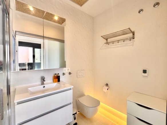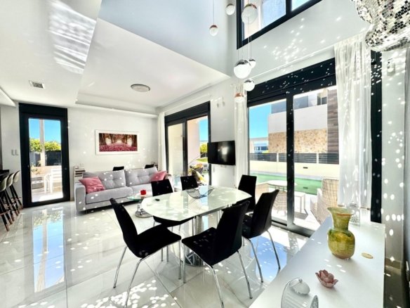 modern detached villa built in 2021, ready to move in and fully furnished, located in a quiet and sunny area close to the beach and all amenities. this stylish property combines space, light and comfort and is ideal for year-round living or as a second home on the costa blanca. the villa has a built area of 285 m² with 185 m² of living space, distributed over two floors plus a spacious basement. inside you will find four bedrooms and four bathrooms, with a modern open layout and large panoramic windows that provide plenty of natural light. outside you can enjoy a private garden with swimming pool, several terraces and a beautiful rooftop solarium with jacuzzi. thanks to the south-facing orientation the property enjoys sun almost all day. the property also features air conditioning, individual electric heating, built-in wardrobes, a storage room and a private parking space. the solar panels provide additional energy efficiency and lower electricity costs. the location is ideal: the beach is only five minutes by car, supermarkets are five minutes away and a shopping centre can be reached in around ten minutes. alicante airport is approximately 45 minutes away. a modern and comfortable villa, perfect for enjoying the mediterranean lifestyle.