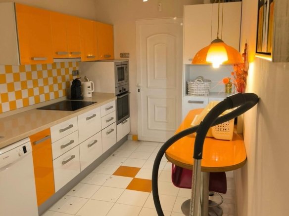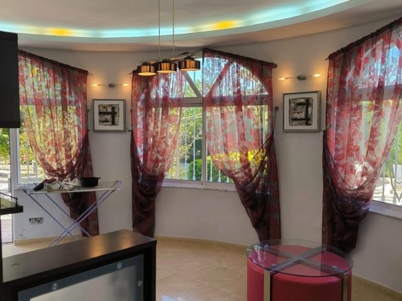Spacious family villa with 4 bedrooms for sale, featuring a living room and a separate office, built on a 1,100 m² plot. The property offers a private 10 × 8 m swimming pool, a separate fully equipped summer kitchen with terrace, and a well-maintained mature subtropical garden with pine trees, palm trees, cacti, pomegranate and lemon trees, ficus and roses. The plot includes an entrance gate and a covered parking area for 2 cars, beautifully covered with ivy. Location The villa is located in the El Chaparral area of Torrevieja, on Flecha Street. This is a quiet and environmentally friendly villa area with large plots and subtropical gardens. Distance to the central beach of Torrevieja and the Mediterranean Sea — 5 km. Property details – Floors: 2 – Total area: 220 m² – Living area: 180 m² Layout Ground floor: – Oval terrace with large windows – Spacious living room 50 m² – Guest bedroom – Separate office with fireplace and natural leather sofa furniture – Separate fully equipped and furnished kitchen – Guest bathroom with shower – Direct access from the kitchen to the garden First floor: – Bright staircase with handrails – 3 bedrooms: – Master bedroom 26 m² with balcony access – Children’s bedroom 14 m² – Fourth bedroom / ladies’ office with balcony access Features The villa is sold fully furnished, including all household appliances, central air conditioning, underfloor heating throughout the house, décor, curtains and kitchenware. Turn-key property — ready to move in.