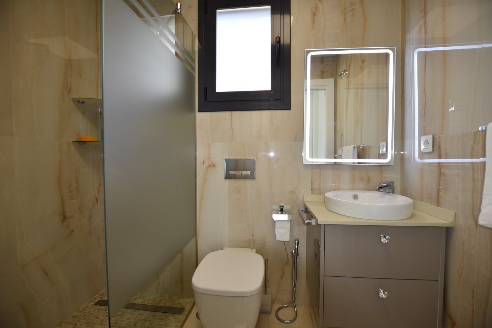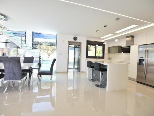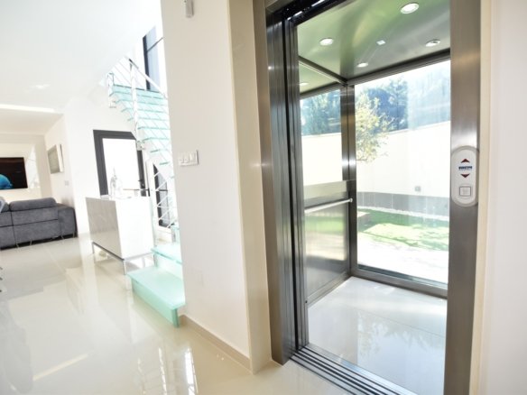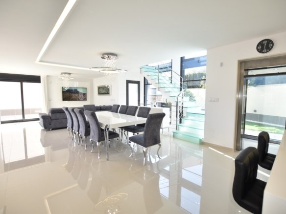 Experience luxury living in this stunning detached villa with panoramic views. Spread over three levels and connected by a private lift, it features a 298 m² layout with a private pool and cascading waterfall, creating a true oasis. The ground floor offers a spacious living-dining area with seamless outdoor access, an open-plan kitchen, utility room, and a master suite with pool views, a large ensuite, and walk-in wardrobe. Upstairs are two bedrooms, each with its own balcony and ensuite, plus access to a terrace and solarium via external stairs. The expansive underbuild includes an open-plan games area, kitchen, two extra bedrooms, a family bathroom, and storage space — ideal for guests or entertainment. Built in 2015 with premium finishes, this south-facing 430 m² plot includes private parking for three cars and combines comfort, design, and functionality.