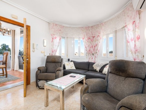 Welcome to this spacious detached villa in the desirable residential area of Los Altos, Torrevieja that offers the perfect blend of comfort, versatility, and mediterranean living. Its prime location provides easy access to all essential amenities while being just a short distance from the beautiful beaches and stunning coastline of the Costa Blanca.You enter the property on the first floor, surrounded by terraces in all directions, to the utility room and then into the kitchen. The lounge is opening up with its beautifully curved wall of windows. From the lounge you access a bedroom and a bath as well as the separate dining area and the large east facing terrace. Upstairs you’ll find the master bedroom with a private balcony with seaview and a bath, as well as another smaller bedroom.Make your way to the ground floor and you will find the georgeous private pool area with plenty of room to entertain and have dinners. The pool can be heated and have fun color settings. Here is also the entrance to the separate quarters with two bedrooms, bath, storage rooms and a lounge. Transform the larger storage room to a smaller kitchen and this will be a self-sufficient private apartment, with its own entrance.Key Features:5 double bedrooms and 3 Bathrooms—plenty of space for large families, guests or tenants.Master bedroom with private balcony facing the sea.The ground floor includes 2 bedrooms and a lounge area, with the potential to create a separate apartment. This is perfect for rental income, multi-generational living, or for children to have their own independent living area. The ground floor also has its own exterior entrance for added privacy.Private heated saltwater Pool (18 m³), ideal for year-round relaxation.Large communal swimming pool for residents nearby.Multiple terraces ensure sunshine throughout the day. Perfect for outdoor dining, relaxation with family and friends.Lovely paved mediterranean garden featuring a variety of fruit trees, including loquat (nispero), apricot, plum, and lemon trees, along with a vibrant hibiscus.Secure gated parkingBright and airy interiors thanks to natural lightReady-to-move-in with potential for personal customizationPrime Location:This villa is ideally located in Los Altos, just a short distance from:La Zenia Boulevard, one of the largest shopping centers in the region, offering a wide variety of shops, restaurants, and entertainment.Excellent schools, making it a perfect location for families.Convenient access to supermarkets, local healthcare and the regional hospital.Only a short drive to Torrevieja town, or a walk to the center of Punta Prima. Both with a range of cultural activities, restaurants, bars and entertainment like theaters and live music.Easy access to major roads, making it an excellent base for exploring the stunning Costa Blanca, including nearby beaches, golf courses, and towns.This villa presents a unique opportunity for those seeking a family home, investment property, or a holiday retreat in one of Torrevieja’s most convenient and sought-after locations. Whether you are looking to live full-time or simply enjoy the Mediterranean lifestyle, this property offers it all.This villa presents an excellent opportunity for both full-time living and holiday retreats with a low yearly owner’s cost. Don’t miss out on experiencing the best of Mediterranean living—schedule a viewing today!Taxes and fees are not included in the price.Contact us for more information and detailed description of specific features in the property.