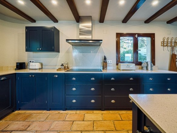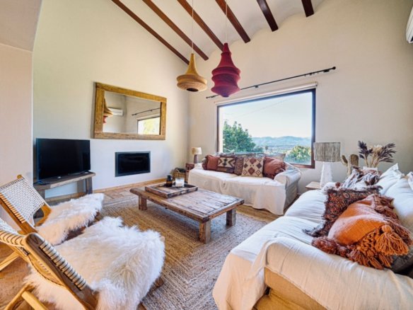 We are proud to present this wonderful villa at the foot of Montgó, with lovely views of the valley, just a short drive from all amenities. This beautiful villa comprises five spacious bedrooms, four full bathrooms, and a guest toilet. On the main floor, we have a large living-dining room with a wood-burning fireplace and a beautiful fully equipped open kitchen, a complete bedroom with an en-suite bathroom, a guest toilet, and another bedroom with an en-suite bathroom and independent entrance. On the upper floor, we find the master bedroom with access to a private terrace, another bedroom, a dressing room, and a large full bathroom. On the lower floor, at pool level, we have an independent entrance to a bedroom with an en-suite bathroom, perfect for our guests. Outside, there is a beautiful garden with automatic irrigation, a good-sized pool, and several terraces, both shaded and unshaded, perfect for enjoying the outdoors, admiring the views, or sunbathing. Additionally, there is an outdoor kitchen in the naya, inviting us to enjoy dinners with friends and family. The entire villa is equipped with double-glazed windows, central heating with diesel, underfloor heating in the bathrooms, hot and cold air conditioning, a storage room, a laundry room, and a 1000-liter water deposit. All of this makes this villa an ideal place to enjoy both summer and winter.