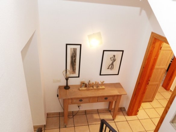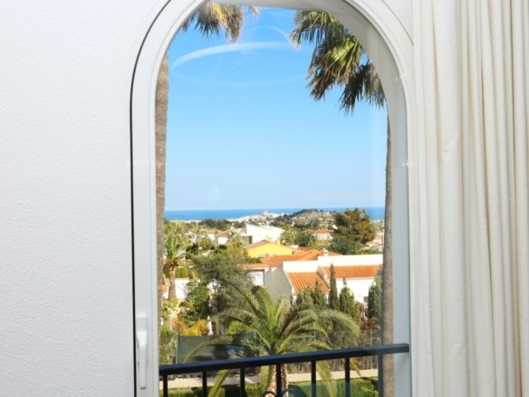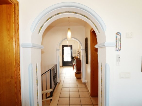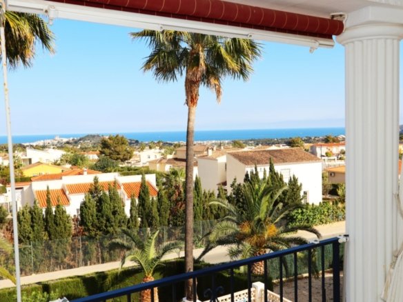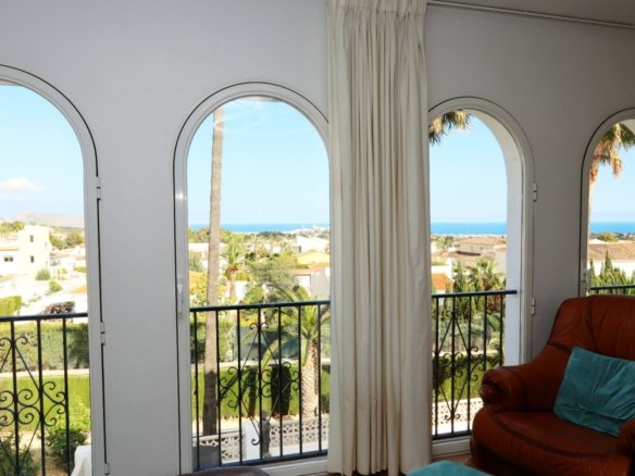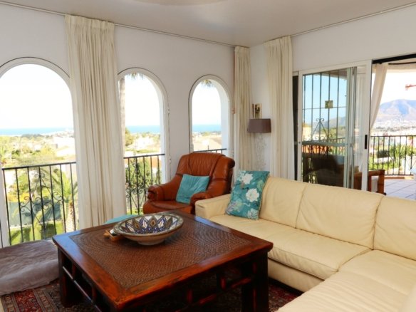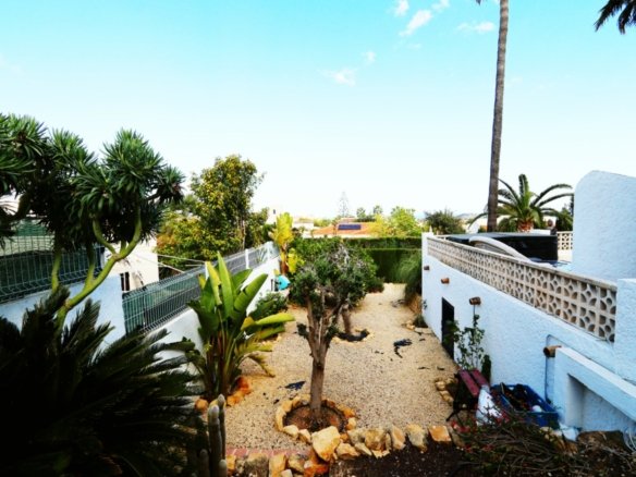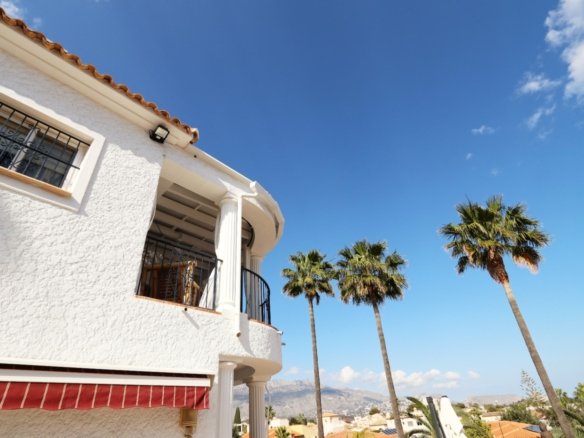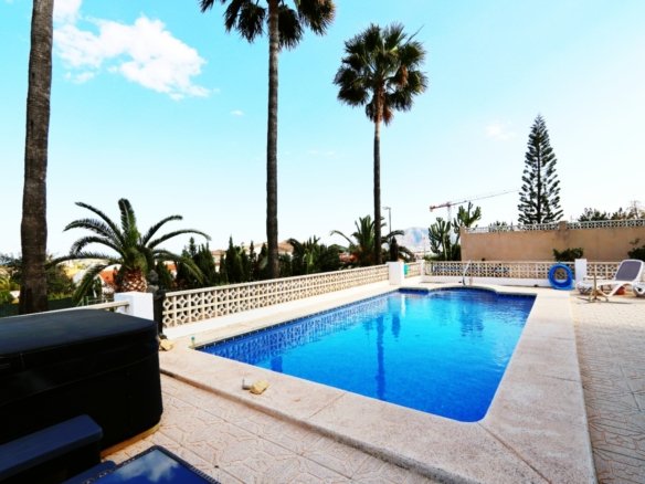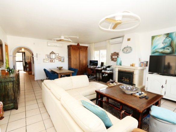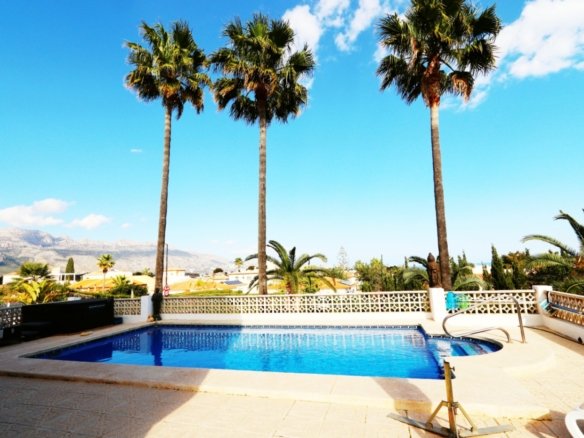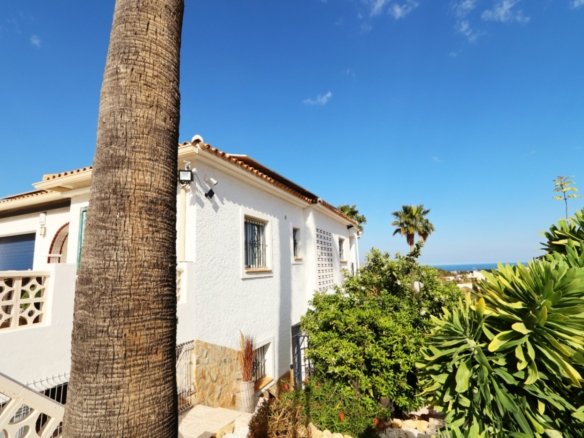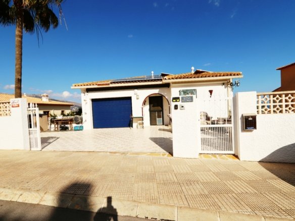 Located in the sought-after area of Bello Horizonte in La Nucia, just outside Altea, this charming family villa is the perfect place to live all year round. The property is distributed over two floors. The main access leads to a large integrated garage and a sunny porch, from which steps lead down to the garden, where you will find orange trees, mature lemon trees and beautiful palm trees.On the entrance level is the master bedroom with en-suite bathroom, a guest toilet, a spacious kitchen, a separate laundry room, and a large living-dining room with fireplace, air conditioning and central heating. Large windows offer spectacular views of the sea, covering Altea, Albir and Calpe. Next to the living room, a stunning terrace with panoramic views becomes the perfect place to enjoy a glass of wine while watching the sunset.The ground floor is accessible from both the inside and the outside, making it an ideal choice for entertaining. This area also has a separate kitchen, as well as 4 more bedrooms (one of them currently fitted out as an art studio), 2 spacious bathrooms and a beautiful terrace overlooking the heated pool area. The low-maintenance gardens, with palm trees, fruit trees and shrubs, create a relaxing atmosphere. The pool is the perfect place to cool off during warm, mild summer nights, and has the added bonus of a poolside Jacuzzi and an outdoor shower.The villa is equipped with solar panels, a battery, a heat pump and an aerothermal energy. Which makes this villa very energy efficient.
