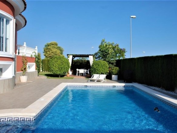 Ciudad Quesada: “Lucia Especial” Detached Villa. Prime Location: 700m2 corner plot facing a park. 10 mins to Guardamar beaches, 5 mins to “La Marquesa” golf, and 30 mins to Alicante Airport.. . Key Specs. Built Area: 237m2 + 178m2 habitable semi-basement.. . Layout: 5 bedrooms, 4 full bathrooms, entrance hall with walk-in closet, bright living room with fireplace, dining area, and kitchen with garden access.. . Condition: Built 2008; fully renovated 2014; pool area updated 2019. Sold fully furnished.. . Premium Features. Comfort: Wood flooring, oil central heating, and ducted A/C with individual room controls.. . Security & Tech: Water softener, alarm with CCTV, double glazing, and reinforced security doors for superior insulation.. . Outdoor Living: Private 5m x 10m saltwater pool, irrigated garden, wooden pergola parking, and proximity to municipal tennis courts.